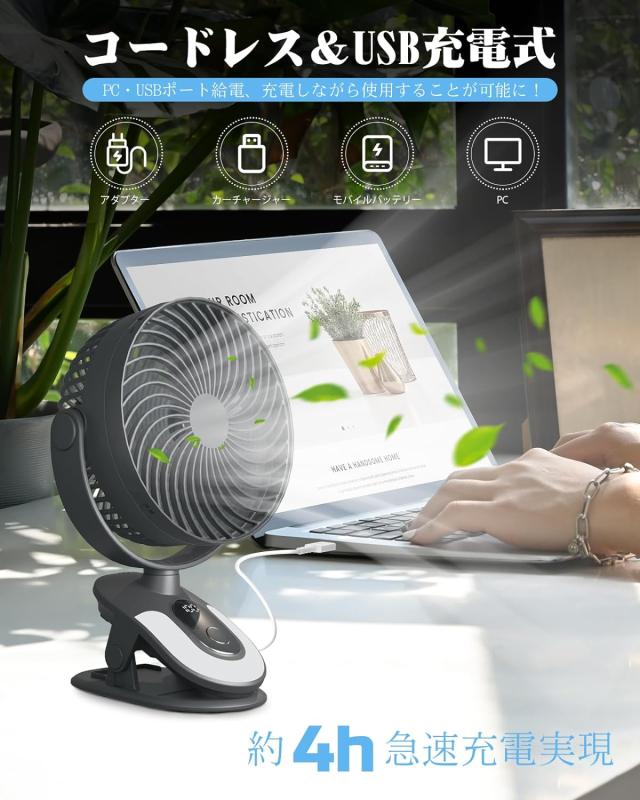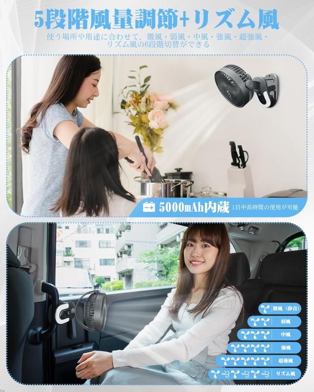 5000mAhの高性能なバッテリーを搭載しており、1回のフル充電で、1日中長時間の使用が可能です。手元に電源があれば充電しながら使うこともできます。真夏の車内、超オススメの充電式扇風機です。充電状態や使用環境によって使用時間が異なる場合がありますので、ご了承ください。多様な充電方法に対応し、便利なUSB充電方式を採用しており、ACアダプター、モバイルバッテリー、車載充電アダプター、パソコンのUSBポートなど、どこでも簡単に充電できます。さまざまな状況で快適な涼しさを保つことができます。