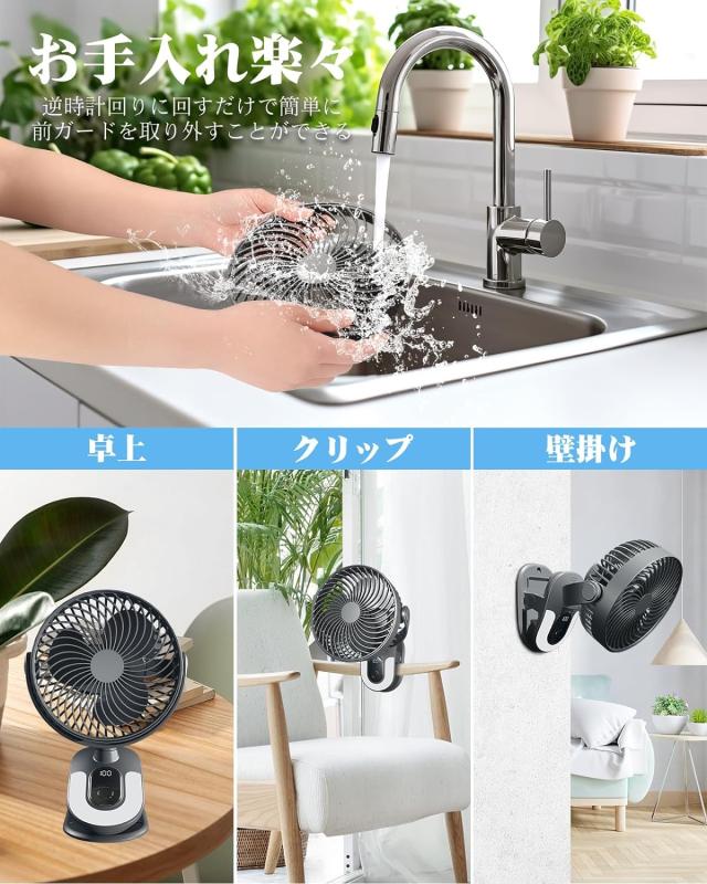 どこでも使用できるワイヤレス卓上扇風機!卓上扇風機として,オフィスデスクでの作業、家でテレビを見ている時のリビングテーブルに置く、寝る時のベッドサイドでの使用、クリップ扇風機として、車中泊やピクニック、車内やテント、湿気の多い洗面所など、様々な場所で使えます。また、壁に掛け扇風機として。さらには暑い夏のトイレでの利用も可能です。USB充電式のこの扇風機は、オフィスでの使用、ドライブ、キャンプ、釣り、など、様々な場面で活躍します。エアコンと併用することで、設定温度を下げて電力を節約できます。