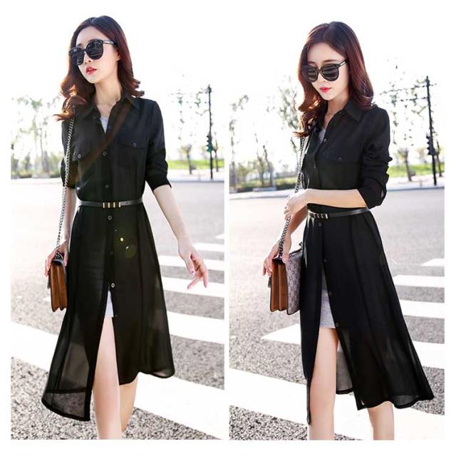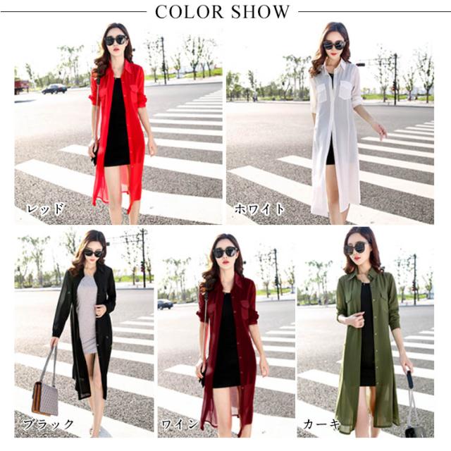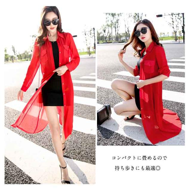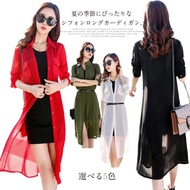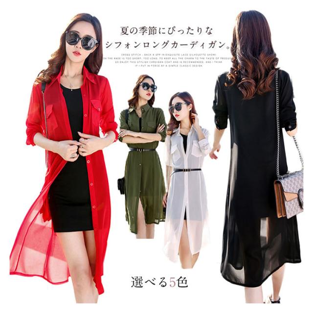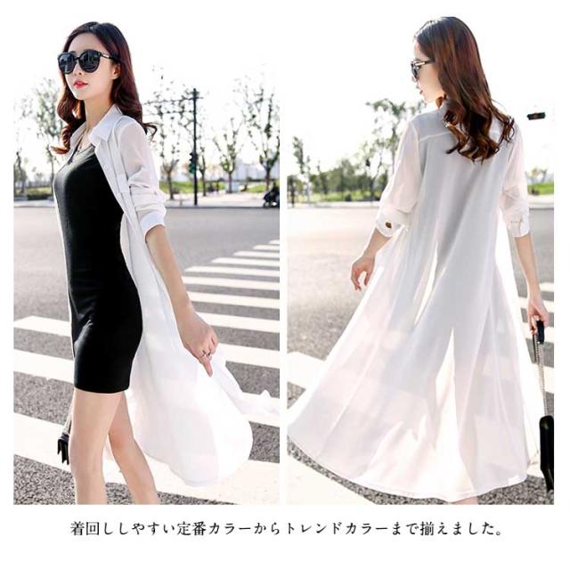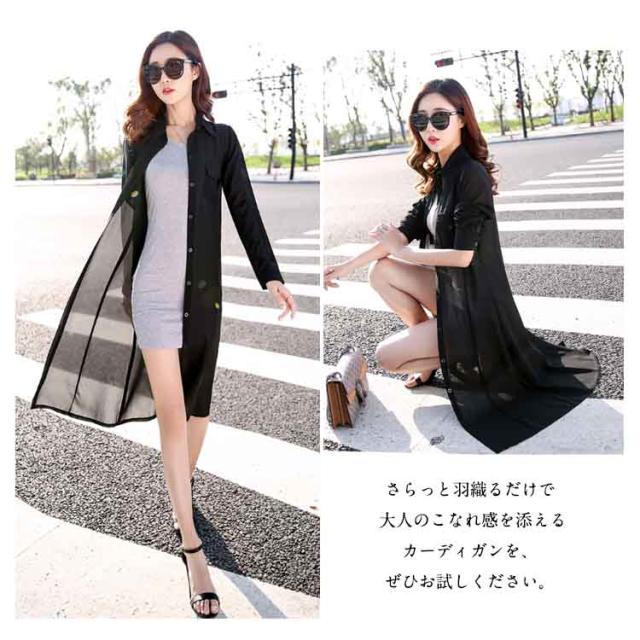 送料無料 ロングカーディガン シフォンカーディガン UVカーディガン カーディガン シフォン 透け シャツ 長袖 折り襟 シンプル 無地 ロング丈 春 夏 秋 レディース