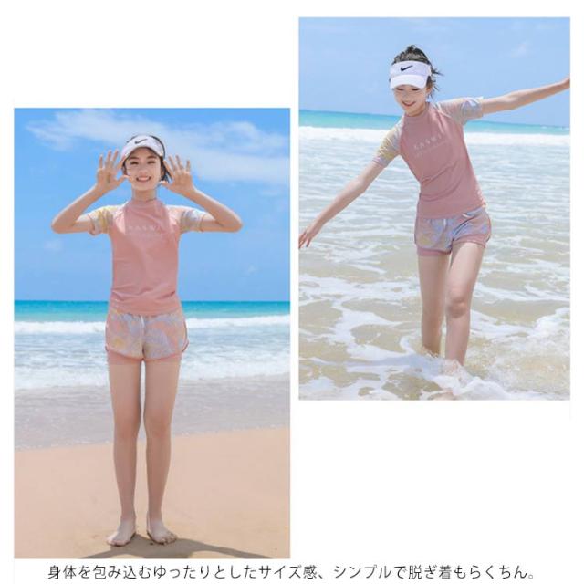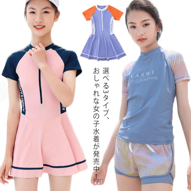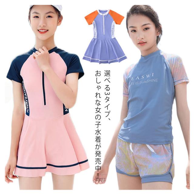 選べる3タイプ キッズ 水着 女の子 セパレート オールインワン 一体型 ショートパンツ ミニスカート 上下セット 子供 ジュニア スクール水着 長袖 半袖 ライン入り 日焼け防止 かわいい 小学生 こども プール 海 水遊び 送料無料