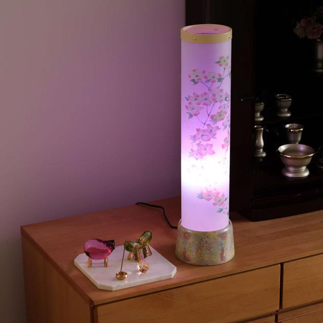 台座は高級仏具と同じ製造方法の陶器製。細微な色入れと表面の凹凸加工が美しく、メイドインジャパンの趣あふれる逸品です。火袋は和紙の雰囲気、灯火は虹色に変化する最新のLED球を使用しています。