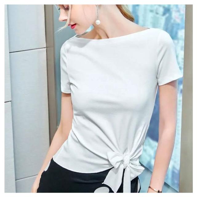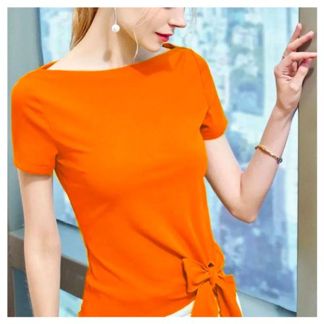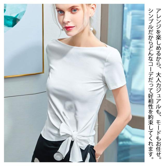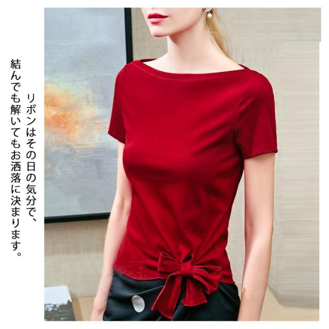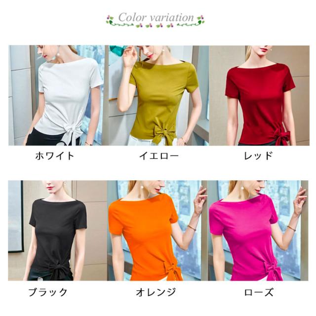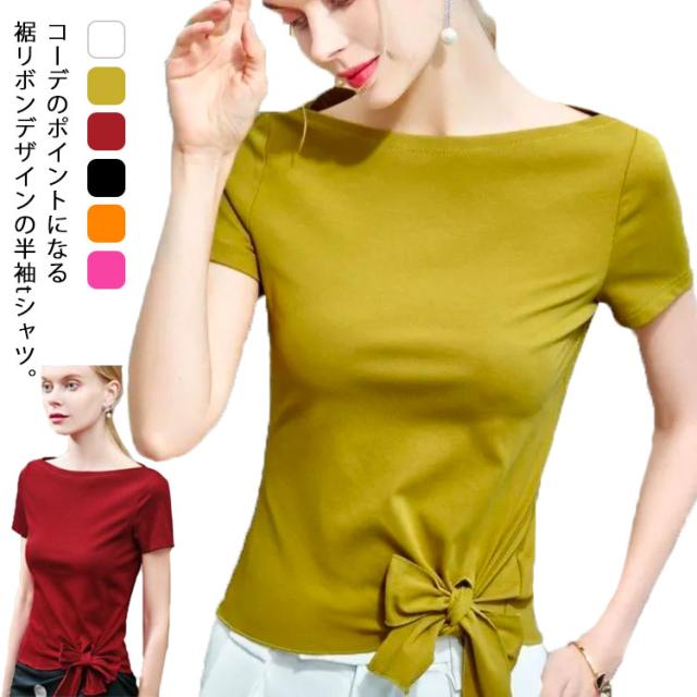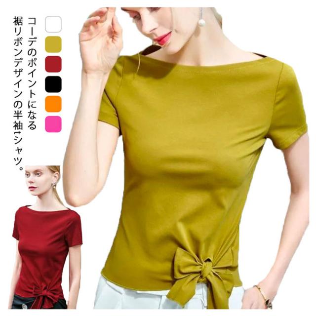 裾リボン Tシャツ レディース 半袖 トップス カットソー プルオーバー アシンメトリー ウエストリボン 無地 薄手 ボートネック クルーネック スリム リラックス 体型カバー 送料無料 ホワイト イエローグリーン レッド ブラック オレンジ ローズ