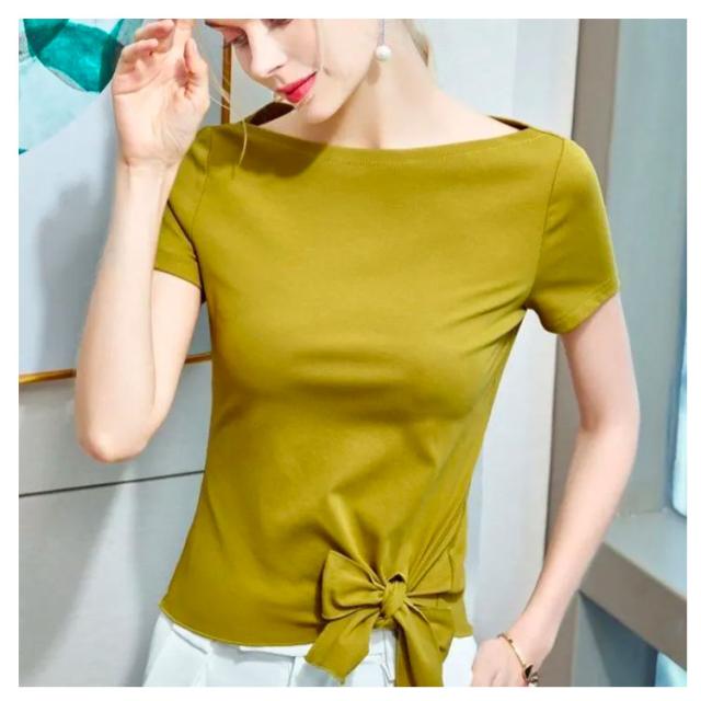 | コーデのポイントになる裾リボンデザインの半袖tシャツ。 リボンはその日の気分で、結んでも解いてもお洒落に決まります。 アレンジを楽しめるから、大人カジュアルも、モードもお任せ。シンプルだからどんなコーデだって好相性を約束してくれます。 もちろん肌触りも譲れない!春・夏に丁度良いカットソー生地を使用し、心地よい肌触り。 フロントもバックも浅めのボートネックネックで首回りをキレイ見せ。 程よい可愛さがいつものコーデをお洒落に、リボンをキュッと結んでスタイル完成! | |