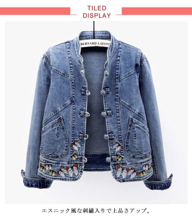 送料無料 デニムジャケット 刺繍 春新作 レディースアウター エスニック系 チャイナボタン 長袖 Gジャン 立ち襟 ジャケット ブルゾン 刺繍ジャケット 春 秋 30代 40代 50代