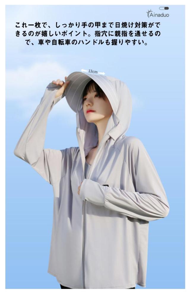 | 羽織るだけで暑い日差しから肌を守るUVパーカー 通常のパーカーより、薄く軽いので動きやすいです。通気性もよく、夏に着ても暑苦しくなりません。 薄手で軽く持ち運びしやすい、まるで着ていないかのような着心地。 これ一枚で、しっかり手の甲まで日焼け対策ができるのが嬉しいポイント。指穴に親指を通せるので、車や自転車のハンドルも握りやすい。 フードつばは一体型、取り外せる2タイプを用意したので、ニーズに合わせてお選びいただけるにもうれしいポイント。 | |