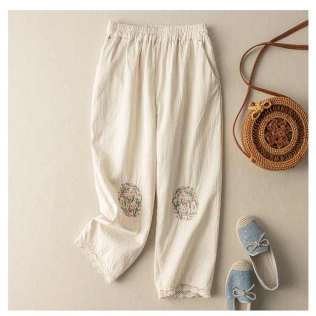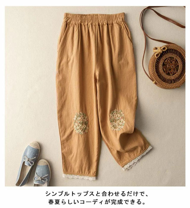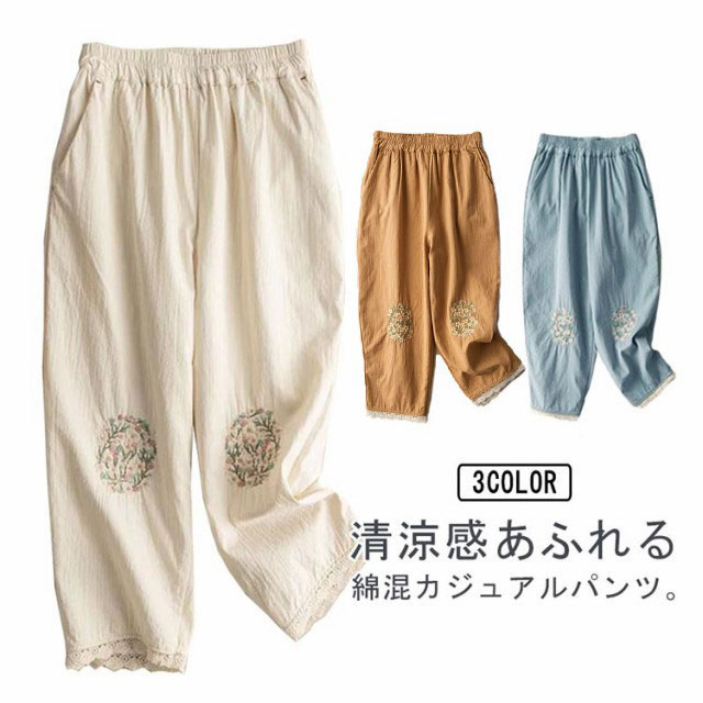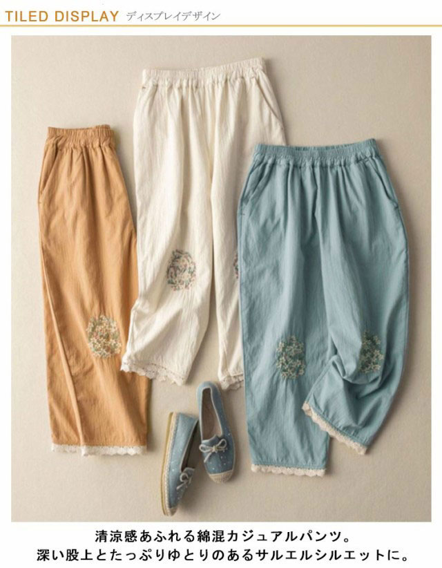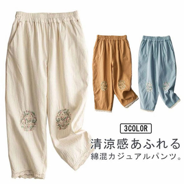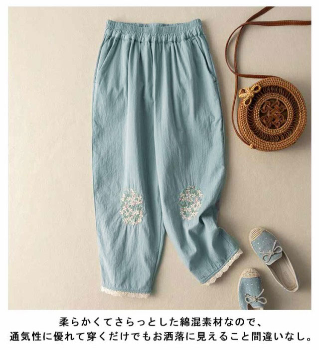 綿 パンツ レディース 刺繍パンツ 送料無料 カジュアルパンツ 裾レース ワイドパンツ サルエルパンツ 夏 薄手 涼しい 春夏 刺しゅう 可愛い ナチュラル