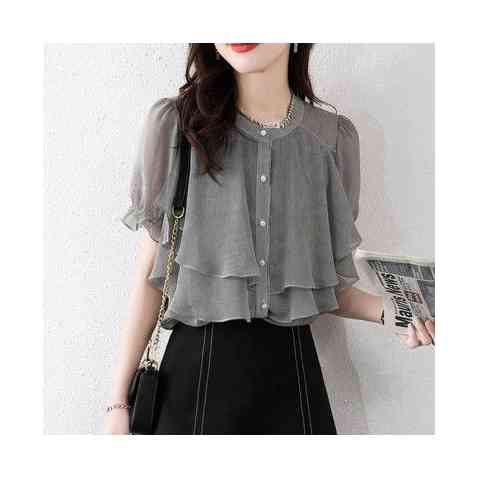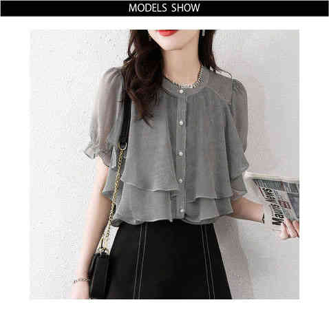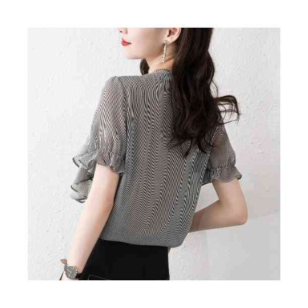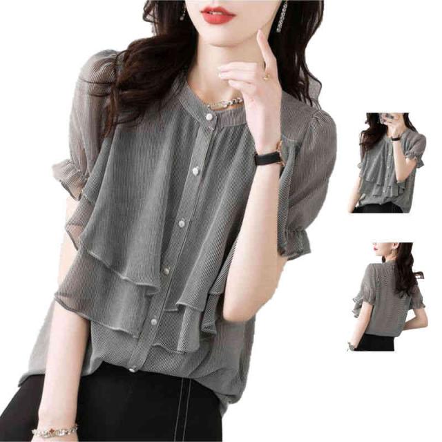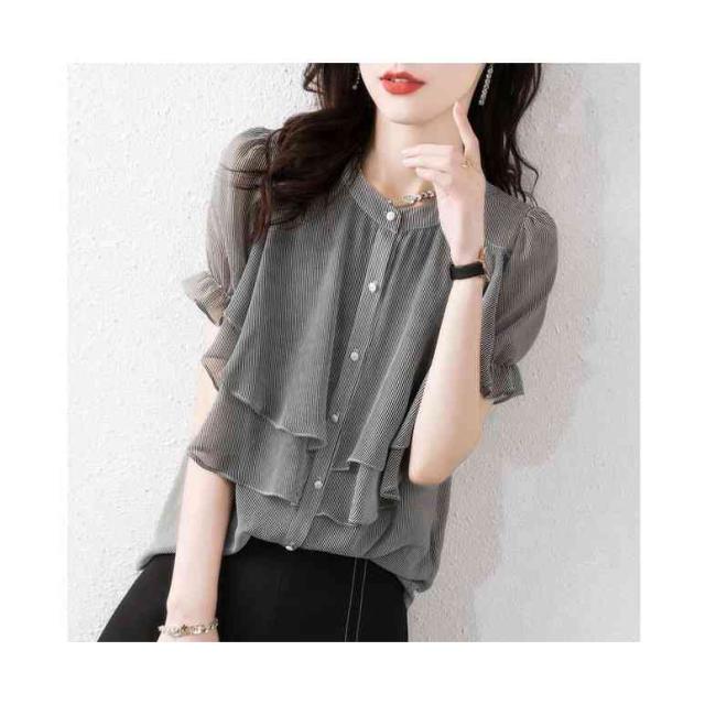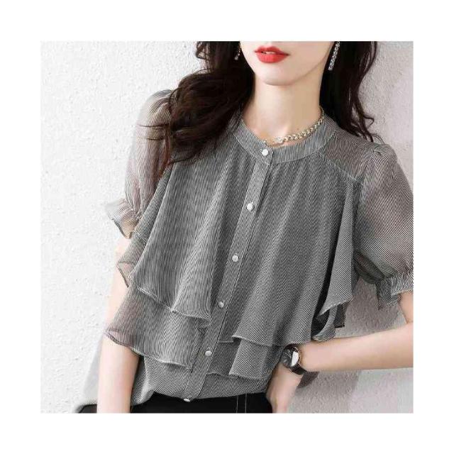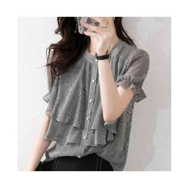 シフォンブラウス レディース 春夏 フリルブラウス おしゃれブラウス ストライプブラウス シャツブラウス シフォン おしゃれ 丸襟 フリル 半袖 シンプル カジュアル おしゃれ 送料無料 おでかけ