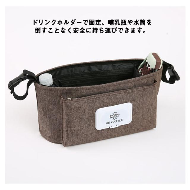 | ベビーカーに取り付けて荷物を収納できるマルチバッグです。 ウェットティッシュケース付きで取り出したい時に、カバンを開けなくても正面からサッと取出しができる。 おむつ、哺乳瓶、薬など、必要な物を取り出しやすく収納することができます。 カバンの中は保温・防水で温かい飲み物や液体の持ち運びに最適な使用。 カバン上部にスマホを収納できる。イヤホンで音楽を聴いたり、透明カバーで大事な通知も見逃さない。 ドリンクホルダーで固定、哺乳瓶や水筒を倒すことなく安全に持ち運びできます。 内側メッシュポケット付き、一目で何が入っているかわかるメッシュポケットで、小さいものを整理整頓。 一時的な収納に便利な外側ポケット。頻繁に出し入れするものの収納に。 紐を簡単に取り外しできるフック式。 お出掛けの時、いざというときに備えて、荷物も多くなりがちなパパ、ママにおすすめ! | |