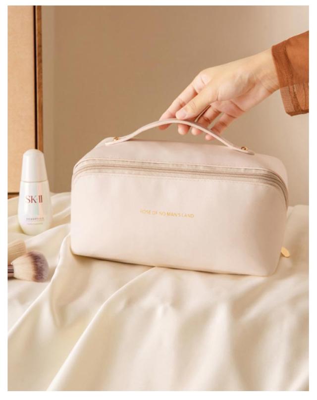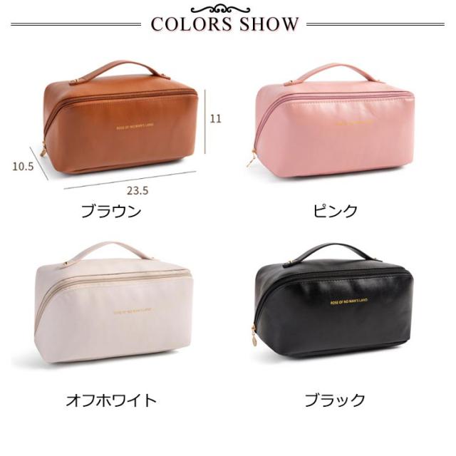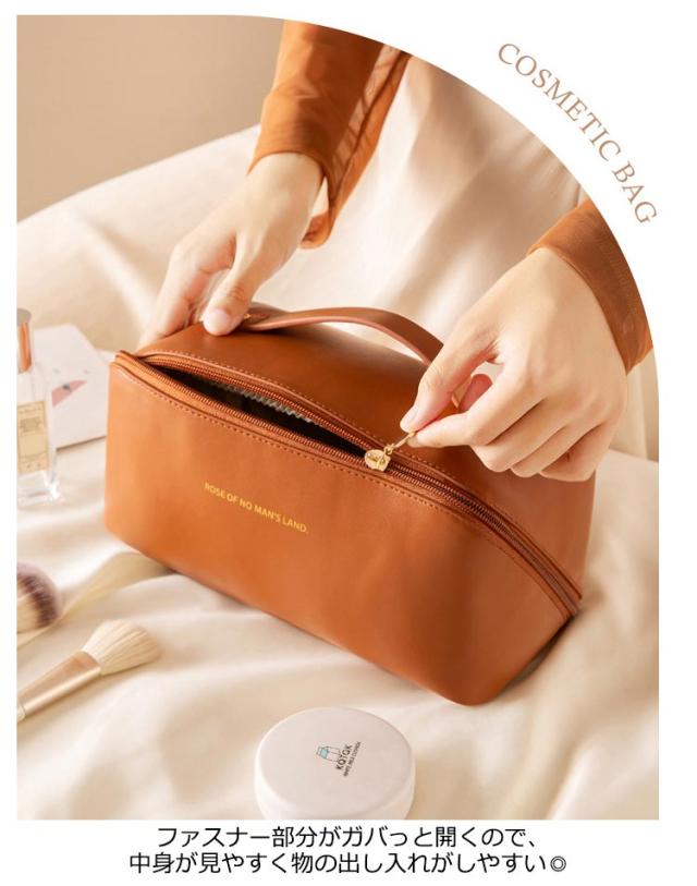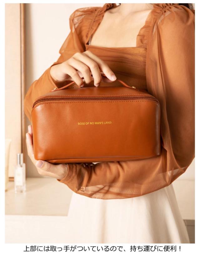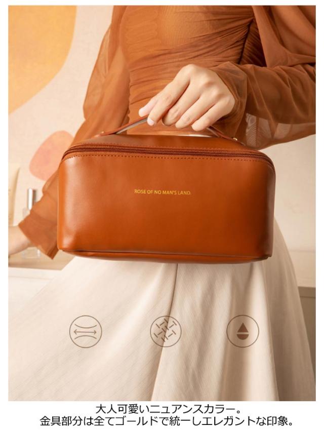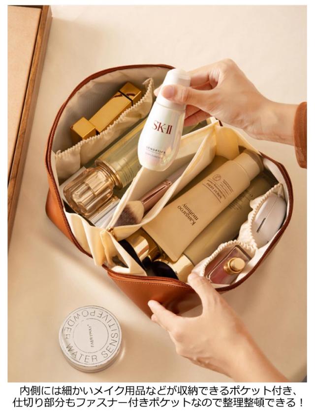 | デイリーにはもちろん、旅行先でも大活躍持ち手付きバニティーポーチ。 BOX型ポーチを斜めに横断するファスナーを開けば、ポーチが全開になるのが特徴的。見やすく出し入れもスムーズに! 化粧品をボトルごと、ライン使いで収納できる大容量が魅力的!お気に入りのメイク道具一式はこのポーチにおまかせ♪ リップやハンドクリーム、ヘアアクセサリーなどの細かなグッズも、機能的に配置されたポケットや仕切りで見やすく整理できるのが嬉しいポイント。 汚れもさっと拭きとれる、軽い撥水効果のあるPUレザーを使用。 艶のある合皮にワンポイントでゴールドカラーのロゴを配置した高見えデザイン♪ お部屋に置いて使ってもインテリアに馴染む、カラーをラインナップ。 | |