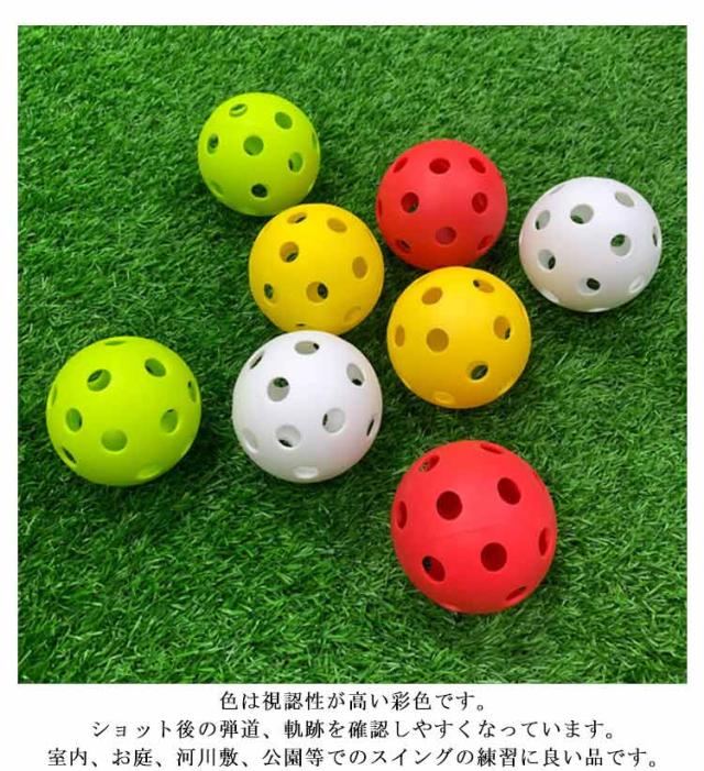 | 100個セット!練習用のゴルフボール 穴あきの軽量なプラスチック製なので、飛びすぎによる心配がありません。 色は視認性が高い彩色です。ショット後の弾道、軌跡を確認しやすくなっています。室内、お庭、河川敷、公園等でのスイングの練習に良い品です。 しっかりした打球音。ボールのスピンにより球筋が協調される穴あき構造。 野球では芯を捉える練習に最適です。 お得な100個セットなので練習中の紛失や破損も気にせず打ち込めます。 室内外問わず使用でき、ゴルフのスイング練習だけでなく、お子様のおもちゃとしてもお使い頂けます。 | |