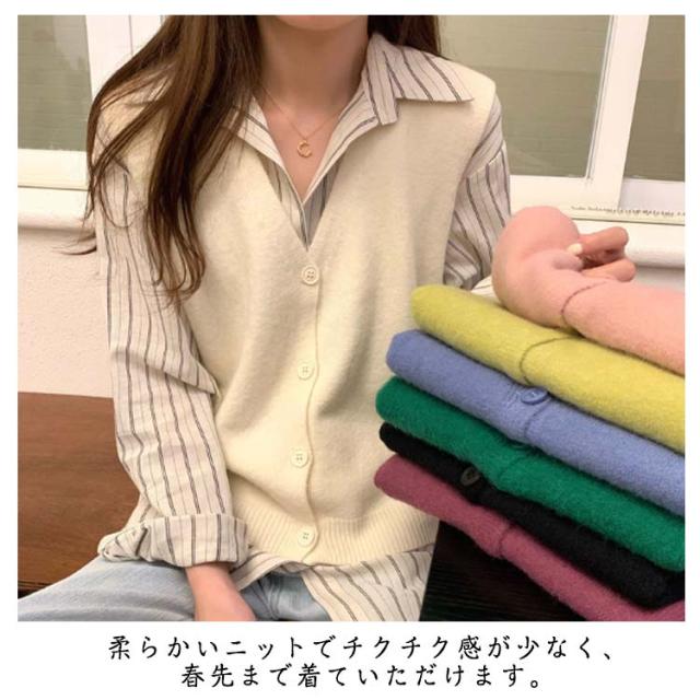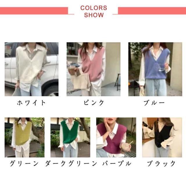 | 全7色!いろんなレイヤードスタイルが楽しめるVネックニットベストです。 柔らかいニットでチクチク感が少なく、春先まで着ていただけます。 前を開けて羽織ってもOK。 キャミソールの上から一枚でも、ワンピースやシースルートップスとレイヤードしても楽しめるアイテムになっています。 | |