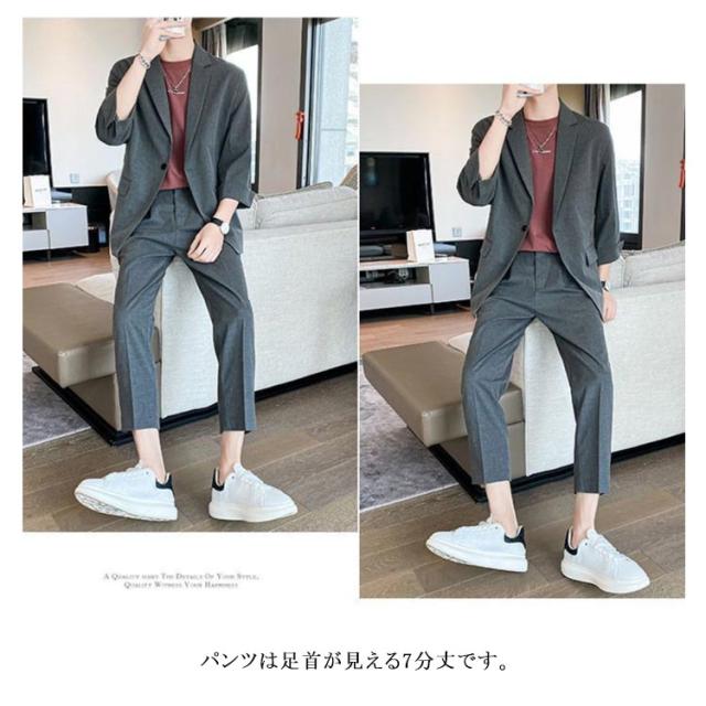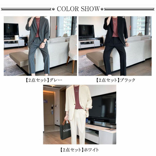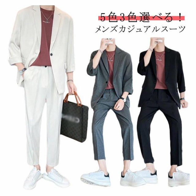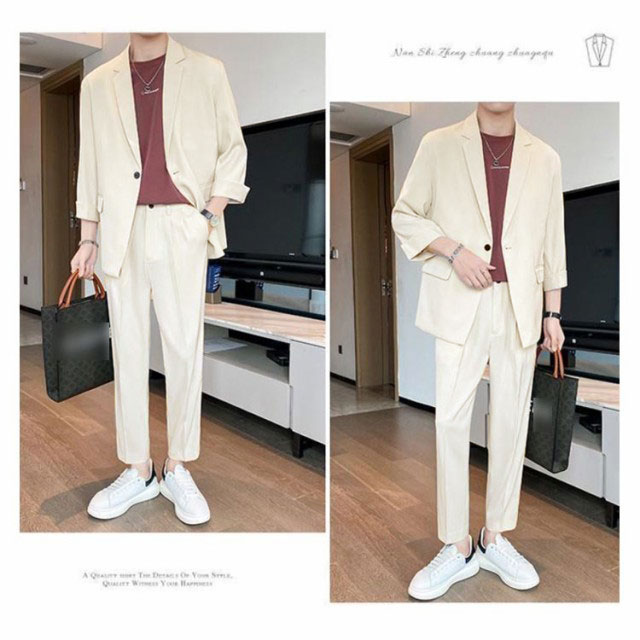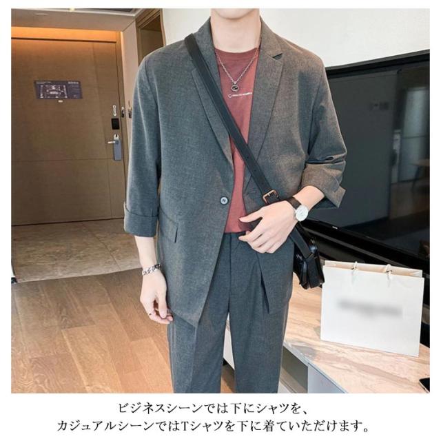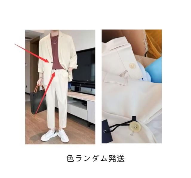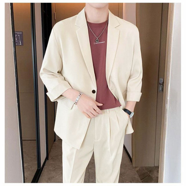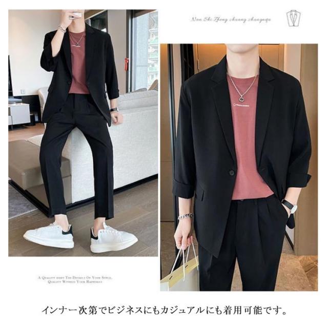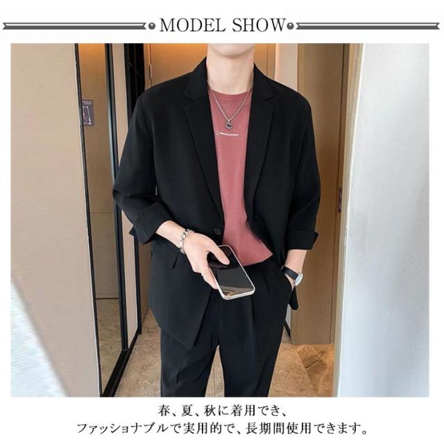 | 5色3色選べる!メンズカジュアルスーツ 春、夏、秋に着用でき、ファッショナブルで実用的で、長期間使用できます。 インナー次第でビジネスにもカジュアルにも着用可能です。 ビジネスシーンでは下にシャツを、カジュアルシーンではTシャツを下に着ていただけます。 パンツは足首が見える7分丈です。 | |