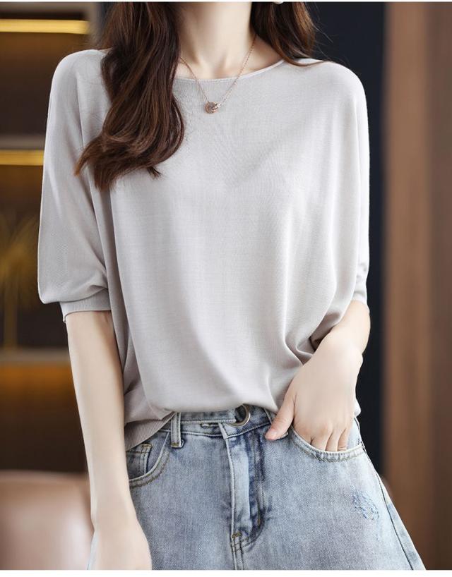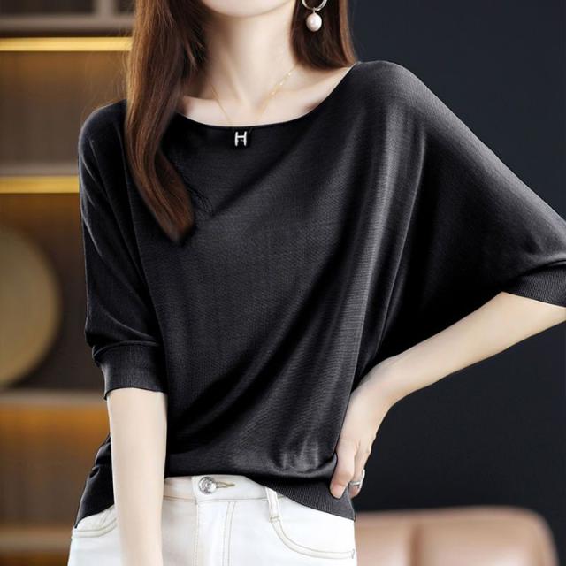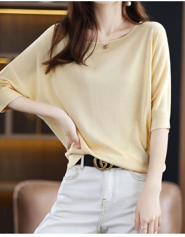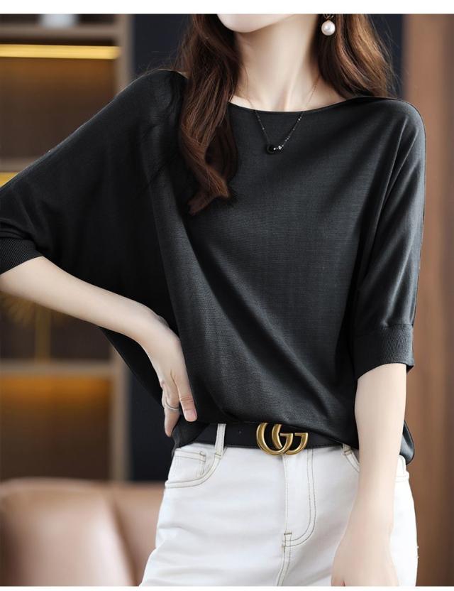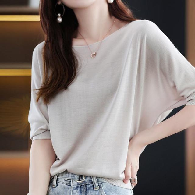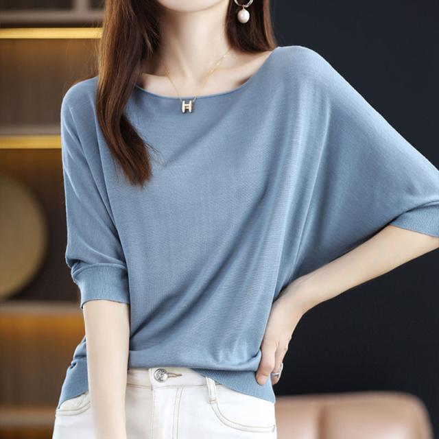 送料無料 ドルマンニット サマーニット 半袖 レディース ボートネック リブニット 半袖ニット 二の腕カバー プルオーバー UV 薄手 抜け感 無地 細見え トップス