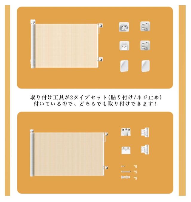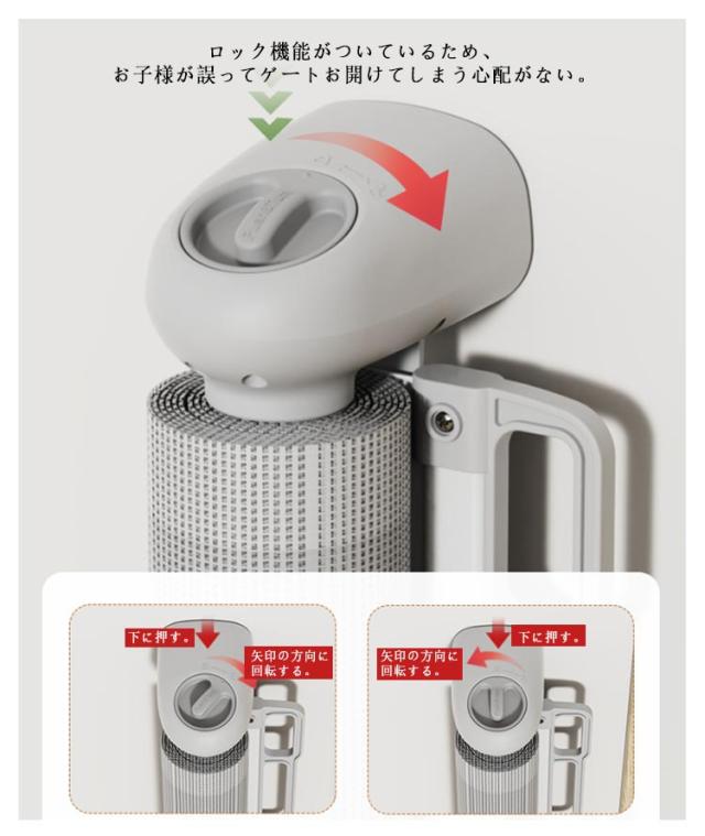 | セーフティゲート インテリアに溶け込むロール式ゲート。 フェンス式の様に段差がないのでつまずく心配なし。 使う時だけ伸ばして、使用しない時は縮めておける! 台所、廊下、玄関など、好きな場所に取付できる! ゲートを引き出す角度が変えられるので斜めに設置できる。 メッシュ素材でぶつかっても安心! 足元がバリアフリーだから移動がスムーズ! 取り付け工具が2タイプセット(貼り付け/ネジ止め)付いているので、どちらでも取り付けできます! ロック機能がついているため、お子様が誤ってゲートお開けてしまう心配がない。 下に押す。 矢印の方向に回転する。 矢印の方向に回転する。 希望の高さまで上下にスライド可能! 設置高さは86cm以上必要! テープ貼り付けの場合、8*8cm位置予備必要! 貼り付けテープは8*8cm。 | |