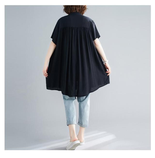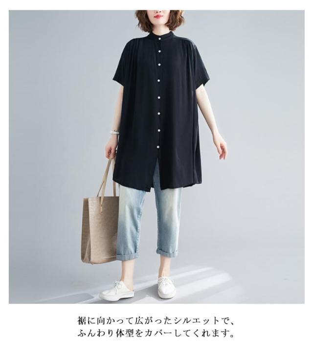 フレアブラウス ロング丈 レディース チュニック 半袖 夏 薄手 シャツ シャツブラウス 黒 ギャザー ロングシャツ 半袖シャツ ブラウス tシャツ トップス ノーカラー ゆったり 体型カバー シャツ 30代 40代 50代 シンプル 通勤 大人 女性 送料無料