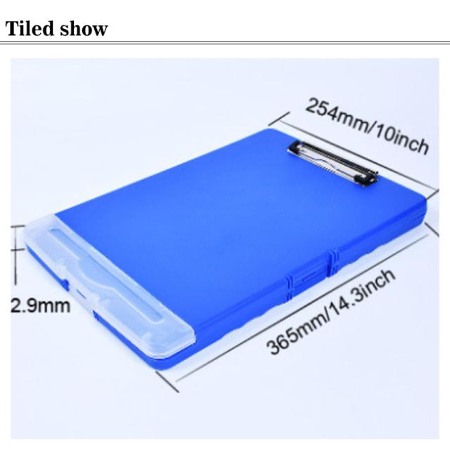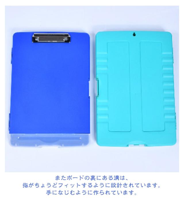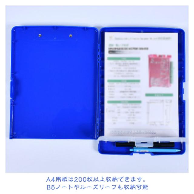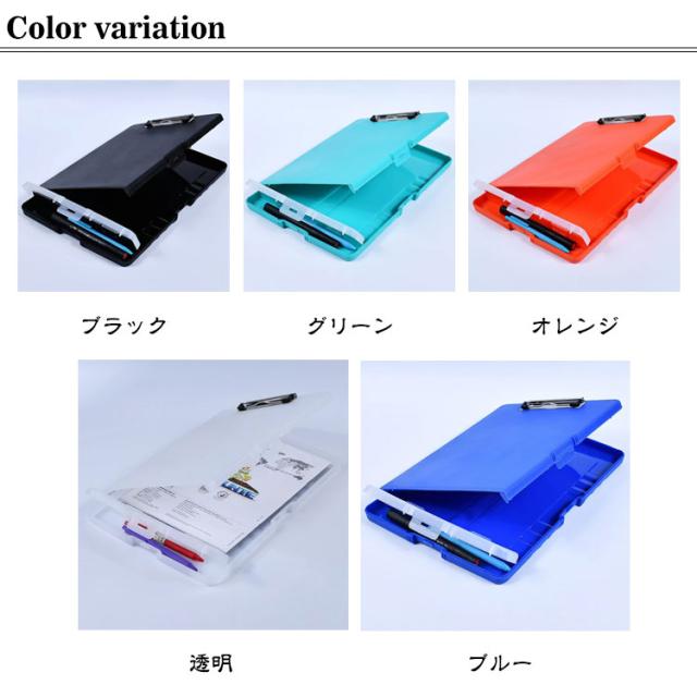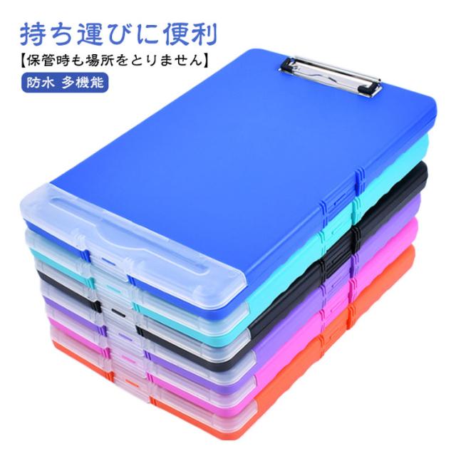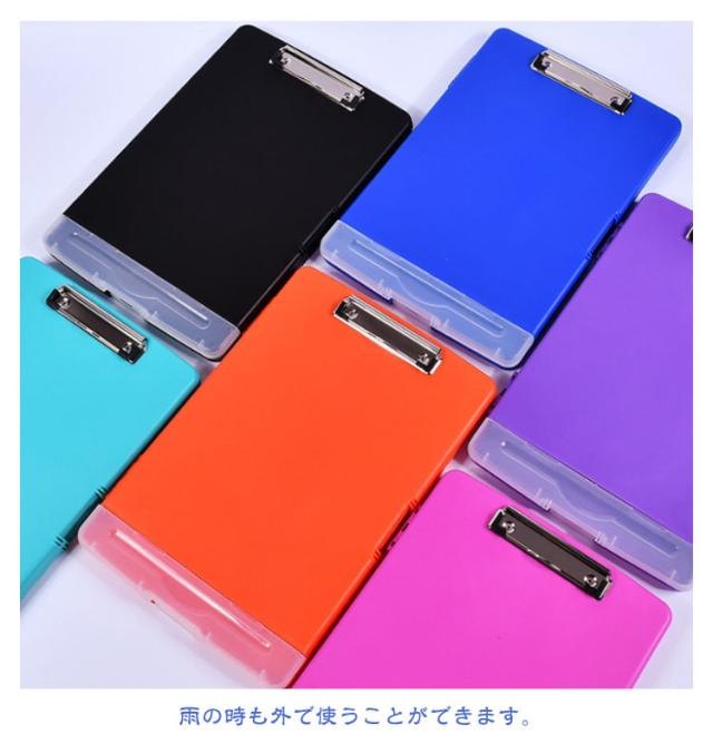 | A4用紙は200枚以上収納できます。B5ノートやルーズリーフも収納可能 ボードの下部には筆記用具を収納できるポケットがあります。ペン、消しゴム、定規などを収納できます。 *A4のクリアファイルは収納できません。構造上A4用紙よりも大きく作られているためです。ご了承ください。 【持ち運びに便利】 一か所に必要な文房具を収納できるので、持ち運びに便利。 またボードの裏にある溝は、指がちょうどフィットするように設計されています。 手になじむように作られています。 【機能的で使いやすい】 一般的なクリップボードと比べて、使いやすいです。 資料の取り出し、文字を書く作業をスムーズに行うことができます。 研修、工事現場、外部調査、スポーツ等でも使えます。 【保管時も場所をとりません】 裏面にフック用の穴があります。壁掛けができます。 簡単に保管できます。 【防水】 プラスチック製なので、水にも強いです。 雨の時も外で使うことができます。 | |