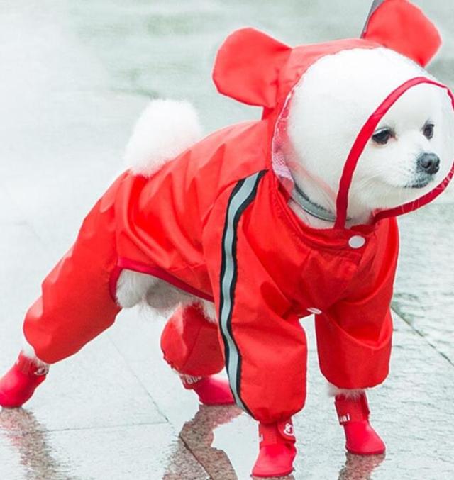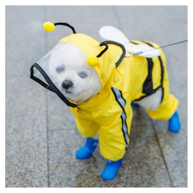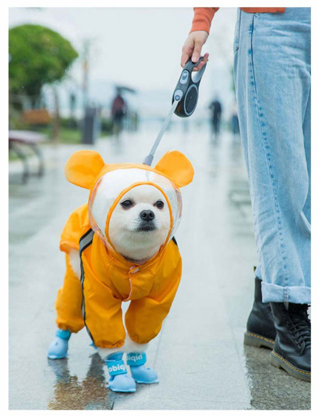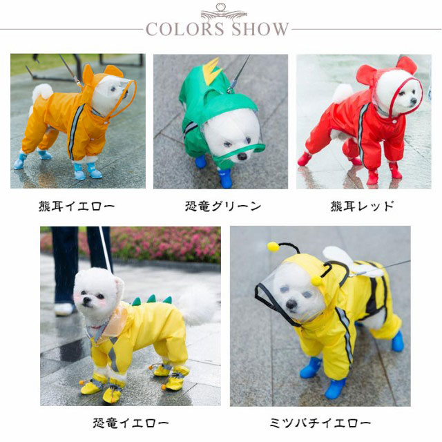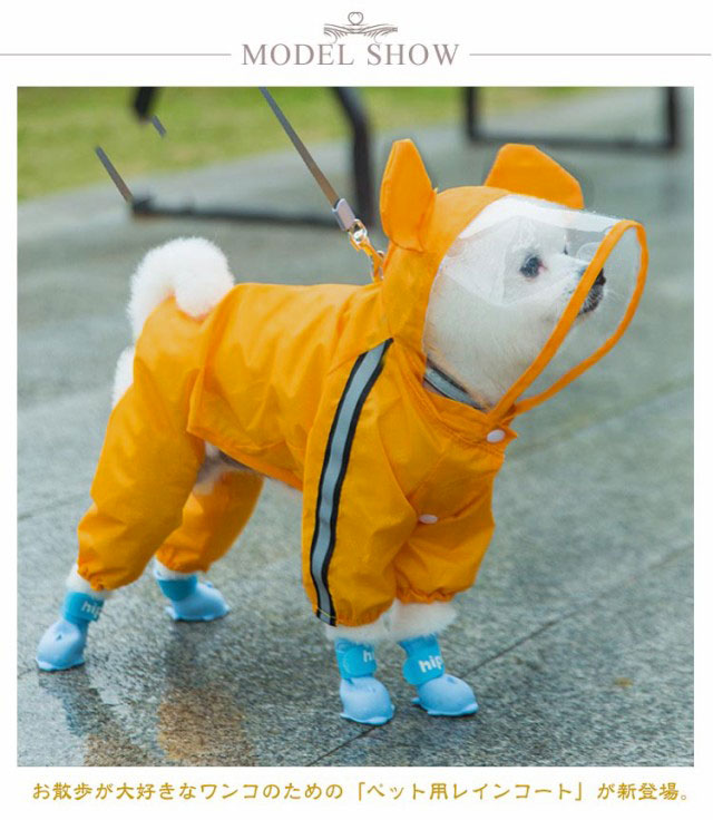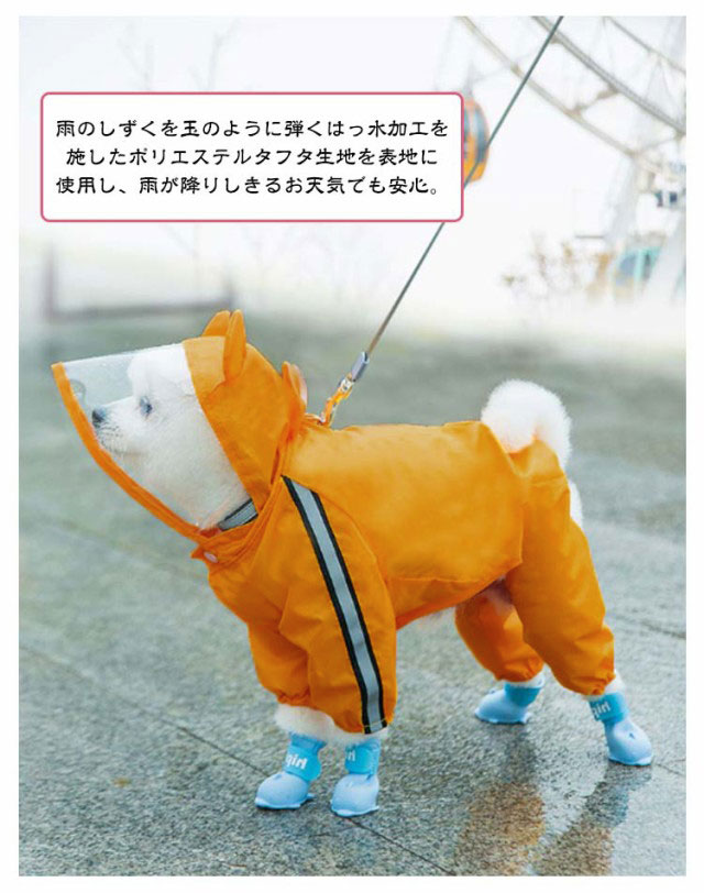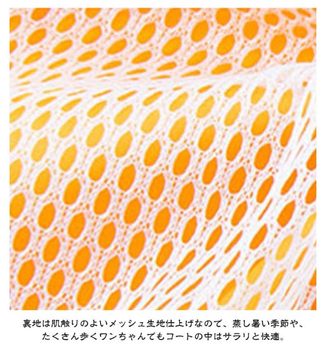 | キュートなデザイン♪お散歩が大好きなワンコのための「ペット用レインコート」が新登場。 コートをワンちゃんの背中にサッと掛けたら、後足・前足の順に袖に通し、前合わせのスナップボタンを閉じるだけで装着が簡単! 雨のしずくを玉のように弾くはっ水加工を施したポリエステルタフタ生地を表地に使用し、雨が降りしきるお天気でも安心。 裏地は肌触りのよいメッシュ生地仕上げなので、蒸し暑い季節や、たくさん歩くワンちゃんでもコートの中はサラリと快適。 柔らか透明フードがお散歩中の視線を妨げず、冷たい雨や強い風からワンちゃんの頭をガード。 袖口のゴムギャザーが足首にぴったりとフィットして、お散歩中の泥はねや雨の侵入を防止。 お腹周りが大きく開いたデザインで、ワンちゃんがおトイレする時にもたつかないゆったり設計。 背中部分の「ダブルDカン金具」で、リードにしっかり接続が可能。コートの下にハーネスを装着する必要のない「ハーネス一体型デザイン」で、ワンちゃんの身体への負担を軽減。 自動車のヘッドライトにキラリと光る☆背中から両脇に掛けて、夜間のお散歩でも安心な格子状のリフレクターライン付き。 | |