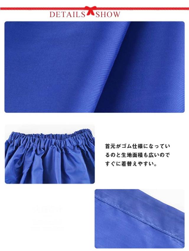 | 収納ポケットが付いたお酒落なお着替え用ケープです! 災害時の簡易更衣室代わりに防災グッツとしても役立ちます。 首元がゴム仕様になっているのと生地面積も広いのですぐに着替えやすい。 男女兼用タイプで、お子様から大人まで使用可能です。 社交ダンス競技会場の限られたスペースで、さっとお着替えができます。 | |