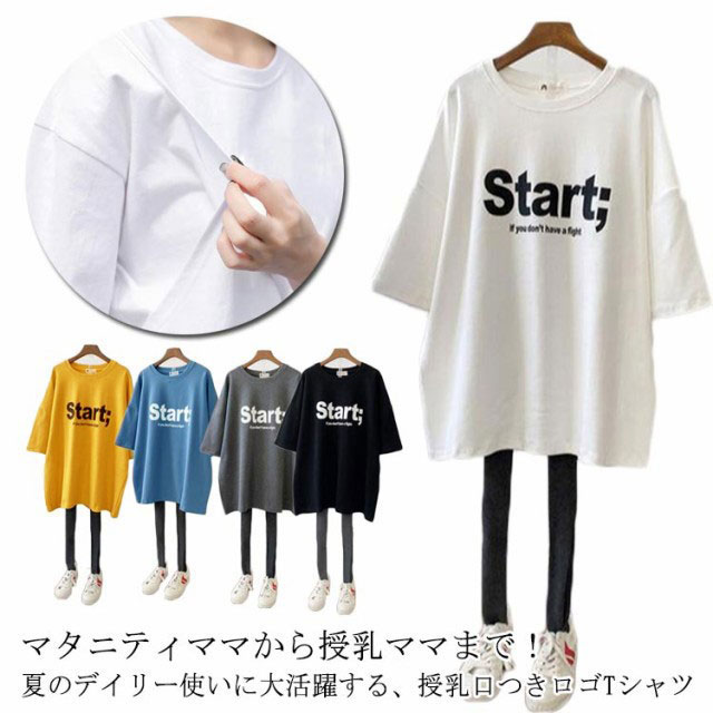 授乳服 Tシャツ 半袖 前開き トップス インナー ロゴTシャツ 授乳しやすい チュニック 授乳服 大きいサイズ おしゃれ カジュアル ゆったり ロング丈 産前 産後 出産準備 マタニティ カットソー 妊婦服 送料無料