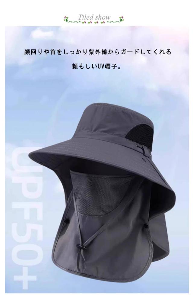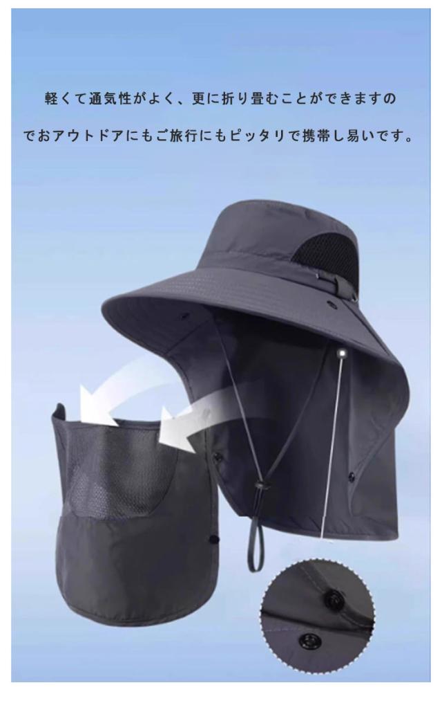| 顔回りや首をしっかり紫外線からガードしてくれる頼もしいUV帽子。 フェイスカバーと首元カバーはボタンで簡単取り外し可能です。 紫外線が気になる季節、外出時は特に紫外線対策したいですよね! 軽くて通気性がよく、更に折り畳むことができますのでおアウトドアにもご旅行にもピッタリで携帯し易いです。 夏場の農作業やウォーキング、登山などの長時間のアウトドア活動に。 | |