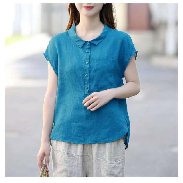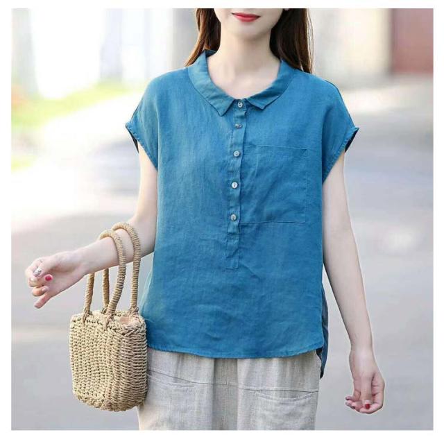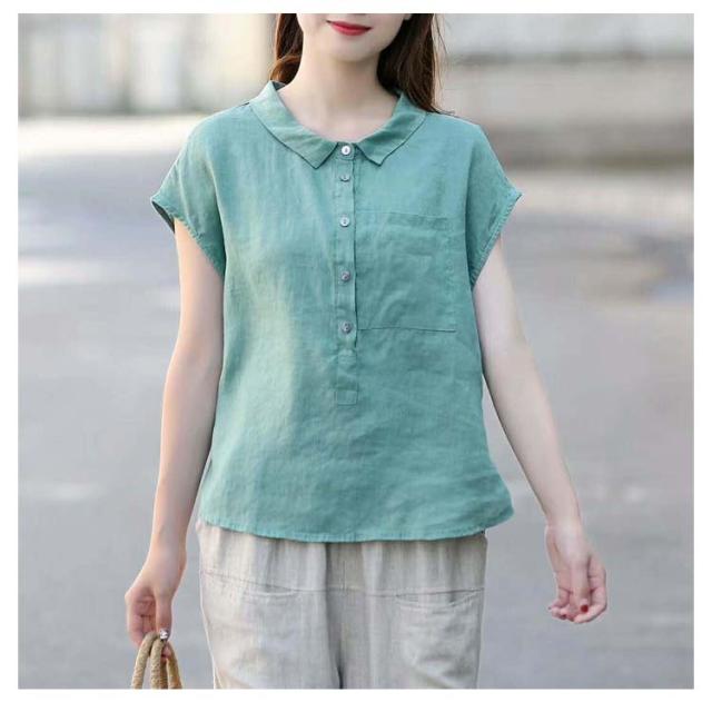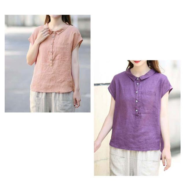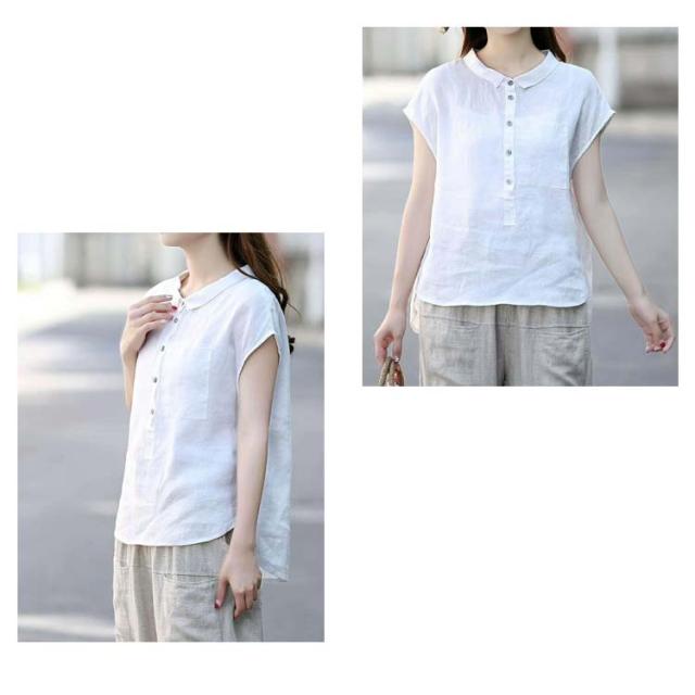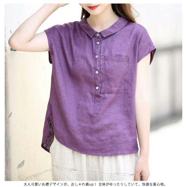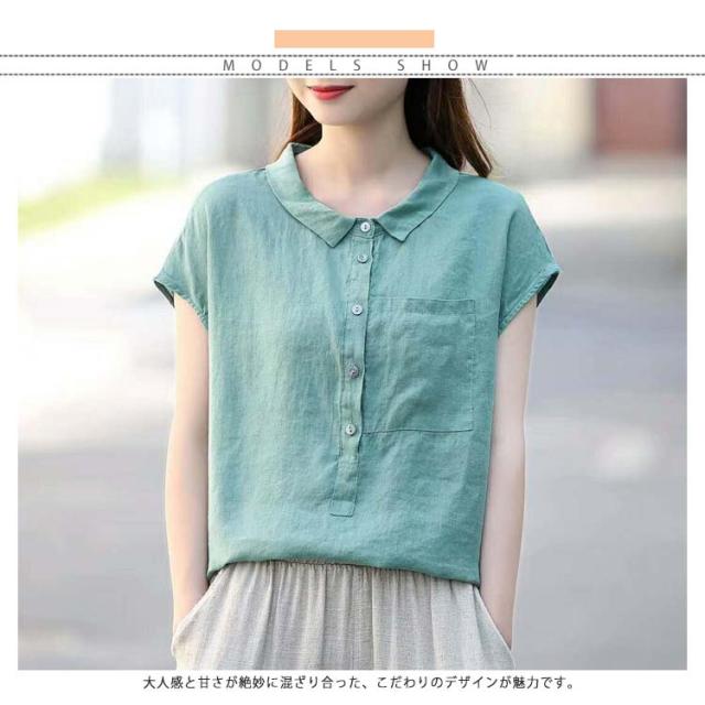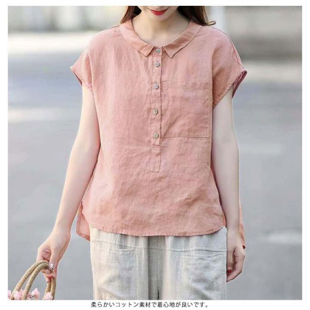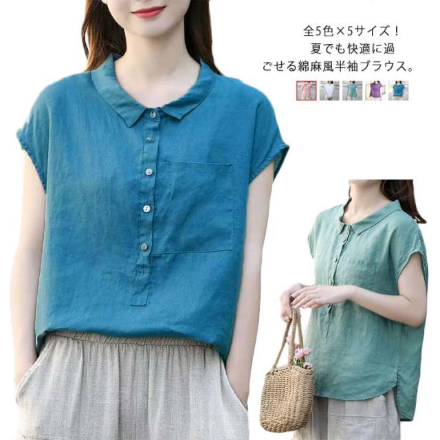 ブラウス 半袖 レディース 丸襟ブラウス トップス 半袖ブラウス プルーオーバー 綿麻風 ナチュラル カジュアル 綿 コットン シンプル 無地 春 夏 送料無料 20代 30代 40代