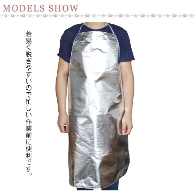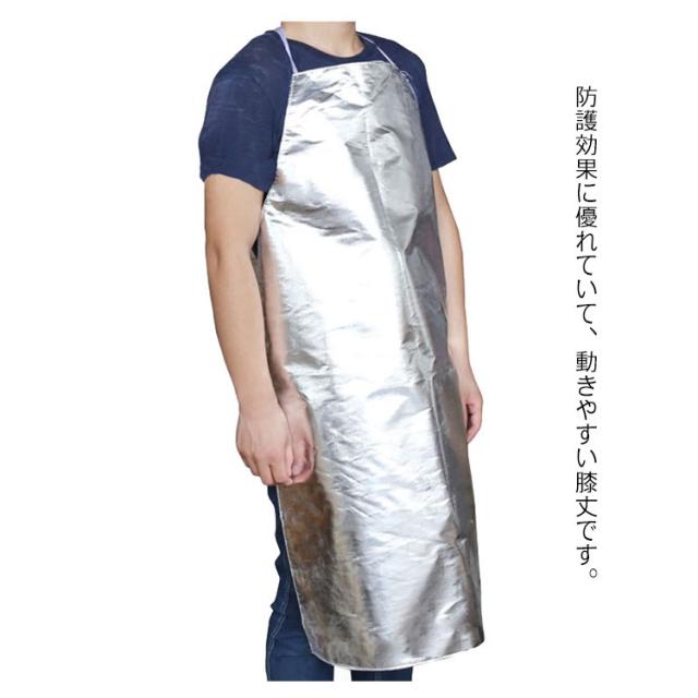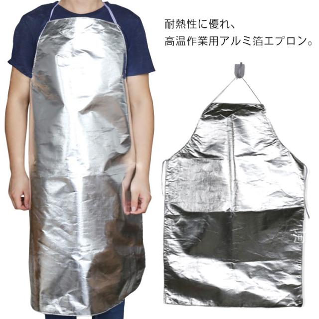 | 耐熱性に優れ、高温作業用アルミ箔エプロン。 着易く脱ぎやすいので忙しい作業前に便利です。 防護効果に優れていて、動きやすい膝丈です。 水と油をはじく性質で、丸洗いもできますので常に清潔に御使用いただけます。 | |