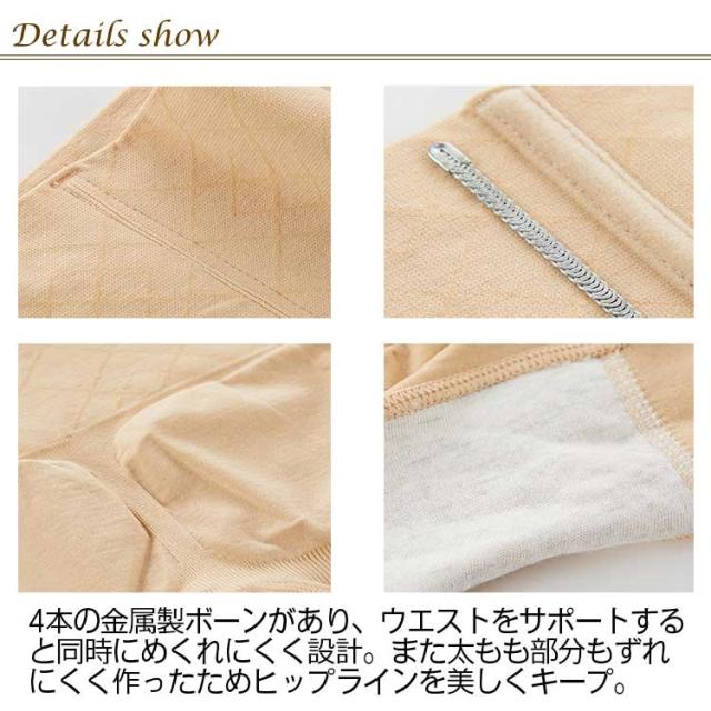 | 脇肉やぽっこり下腹を撃退!下腹を強力サポート! 4本の金属製ボーンがあり、ウエストをサポートすると同時にめくれにくく設計。また太もも部分もずれにくく作ったためヒップラインを美しくキープ。 ソフトな着圧で苦しすぎないから、いつでも使いたくなる構造です。 さらに、伸縮性と通気性に優れ、蒸れないから着けているのも忘れて、ダイエットできる商品です。 ハイウエストなのでお腹からお尻、太ももまでほどよく補正され服をスッキリ着ることが出来ました。 お尻がすっきり見えるのでヒップアップ効果も。 | |