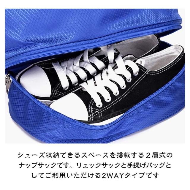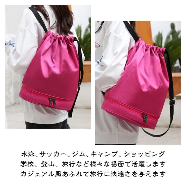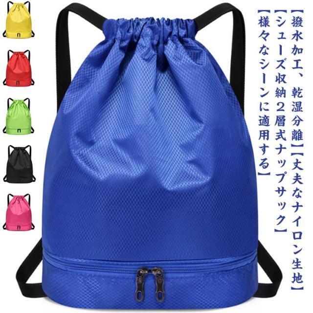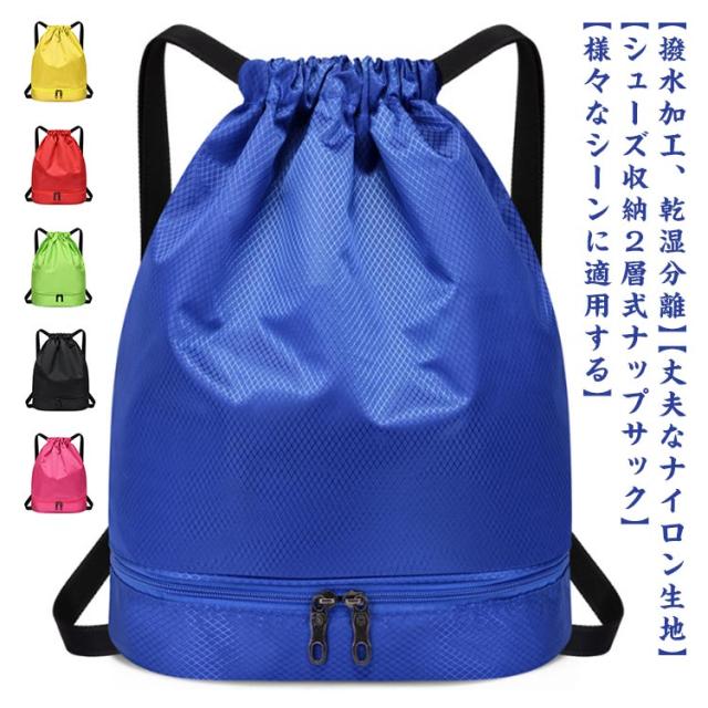 | 【丈夫なナイロン生地】表面はナイロン素材を防水加工しているので、雨の日でも中の物が濡れる心配なし、家に着いたら、表面を乾いた布などで拭き、表面の水分を飛ばしたらOK、型崩れしにくく シワになりにくくなっております。 【撥水加工、乾湿分離】撥水加工のナイロン生地を採用し、型崩れしにくく、突然の雨や雪の日でも安心。バックには乾湿分離のポケットを配置して、汚して濡れた衣類やタオルを清潔な衣類と分けて収納できます。 【シューズ収納2層式ナップサック】シューズ収納できるスペースを搭載する2層式のナップサックです。リュックサックと手提げバッグとしてご利用いただける2WAYタイプです。 【様々なシーンに適用する】水泳、サッカー、ジム、キャンプ、ショッピング、学校、登山、旅行など様々な場面で活躍します。カジュアル風あふれて旅行に快適さを与えます。 | |