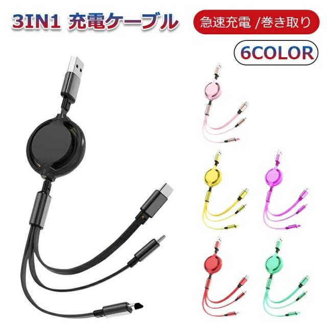 USB 3in1 充電ケーブル 3in1 巻き取り ケーブル iPhone 充電ケーブル iPhone 12 Pro Max USBケーブル 巻き取り USB Type-c 巻取り 充電 Android 一本三役 iPhone 12/12 Pro 3A 急速充電 在宅勤務 プレゼント