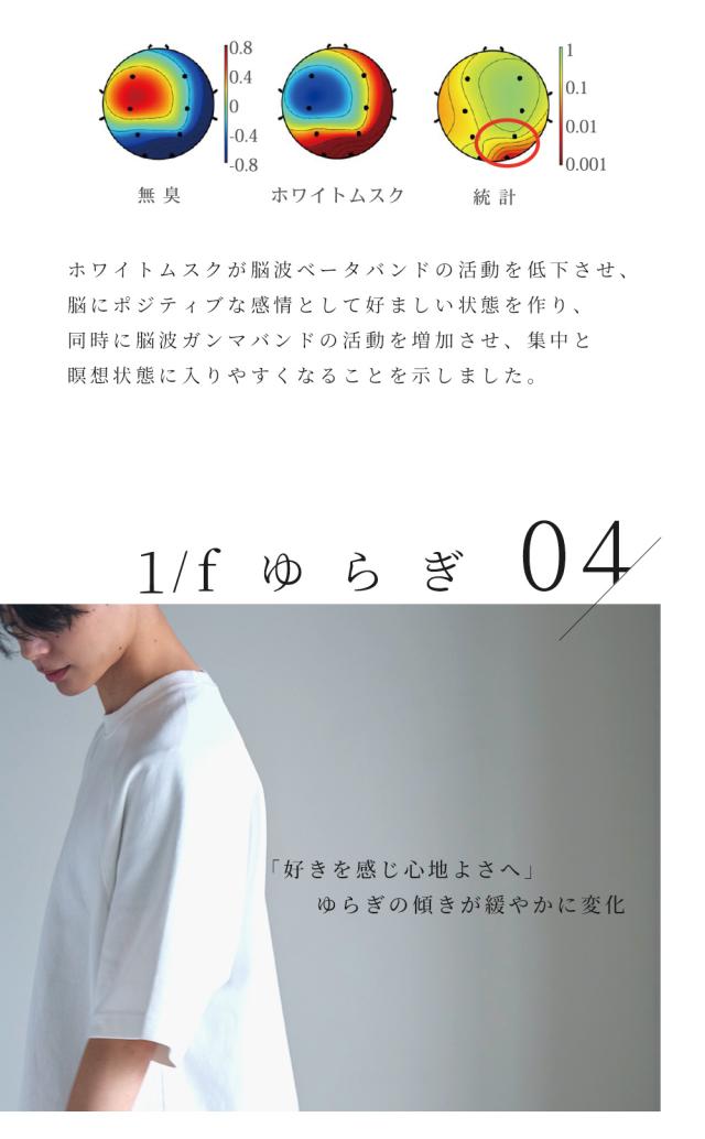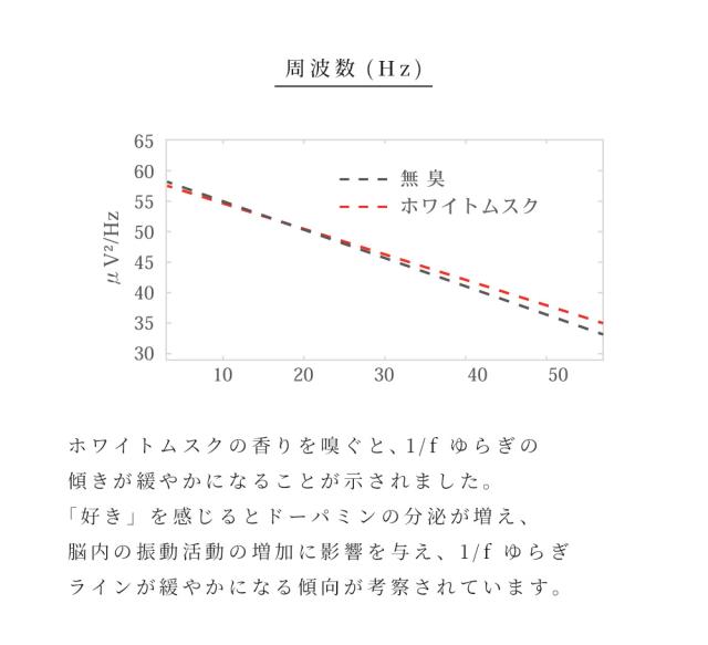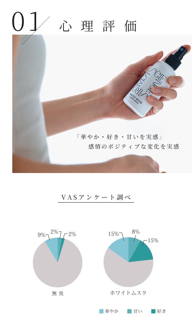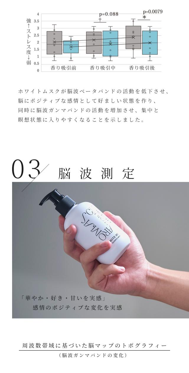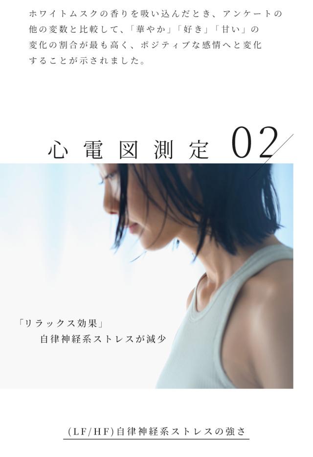 国立大学との共同研究により証明された香りによる癒やし。ポピュラーな香りとして人気のあるホワイトムスクを独自のレシピで作成。甘い大人の香り。