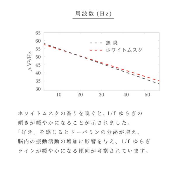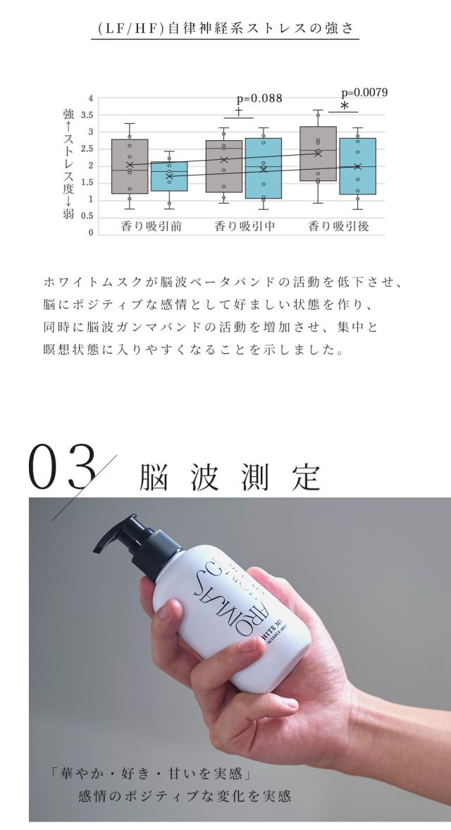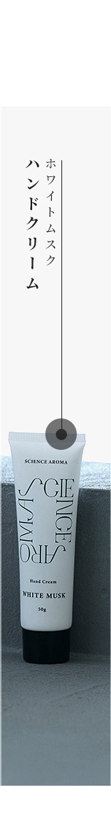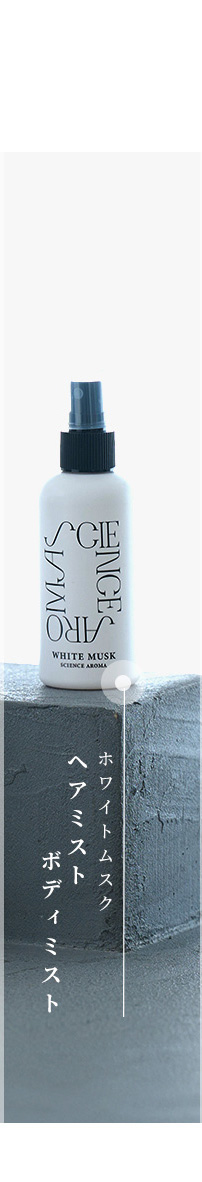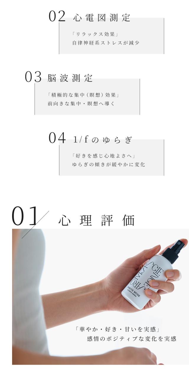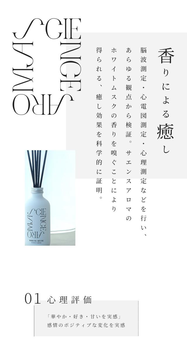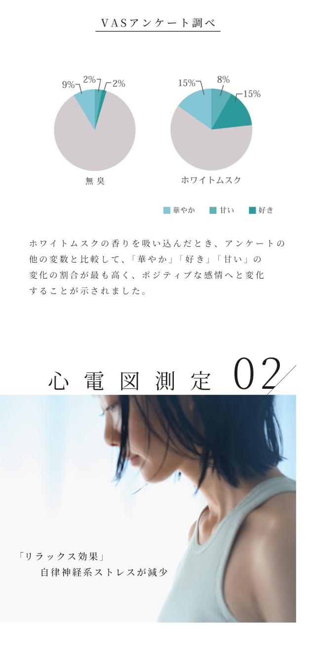 国立大学との共同研究により証明された香りによる癒やし。ポピュラーな香りとして人気のあるホワイトムスクを独自のレシピで作成。甘い大人の香り。