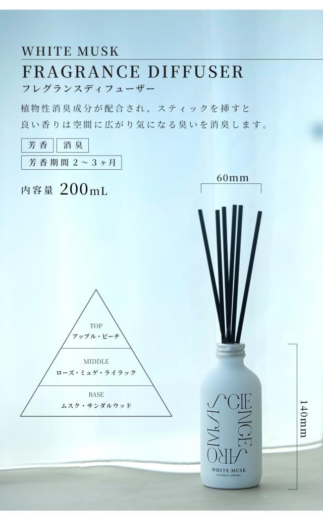 SCIENCE AROMA サイエンスアロマ フレグランスディフューザー 200ml ホワイトムスク リラックス 癒し ポジティブ 自律神経 ストレス 集中 瞑想 植物性 消臭 部屋 スティック ギフト