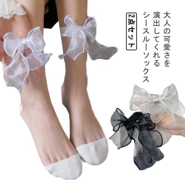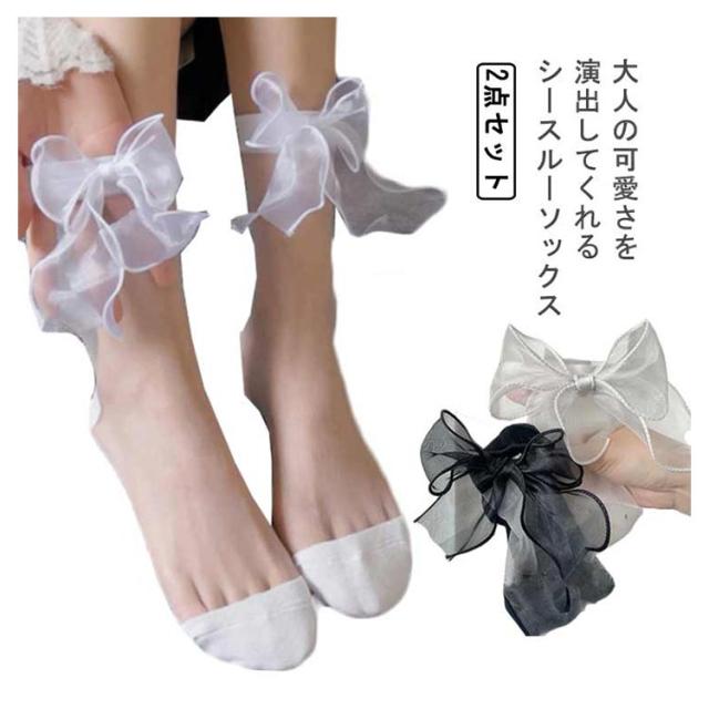 送料無料【2足セット】シースルーソックス レディース 蝶結び付き 靴下 くつした シースルー ソックス ロリィタ コスプレ 黒 白 かわいい 春 夏 シンプル カジュアル ガーリー プレゼント 彼女 ルームソックス ショットソックス おしゃれ 透け感 夏用