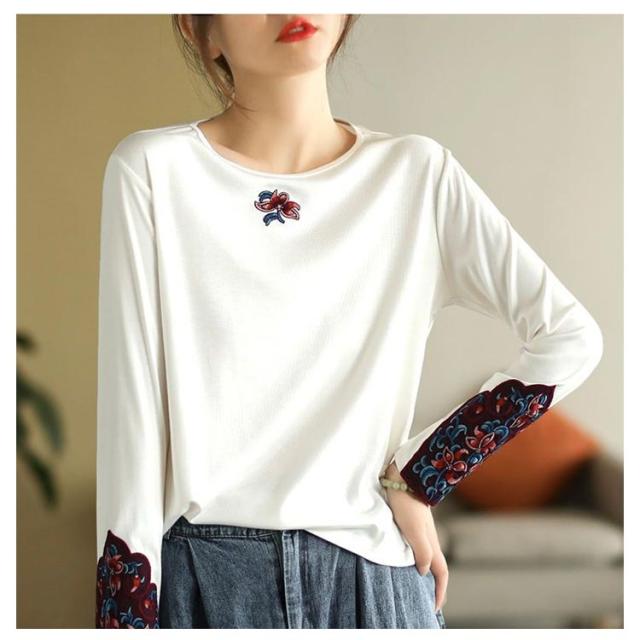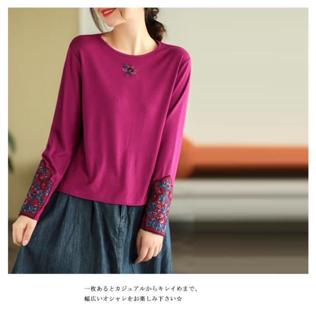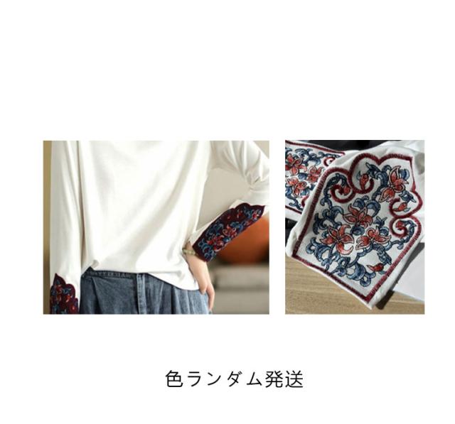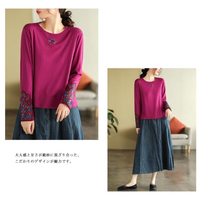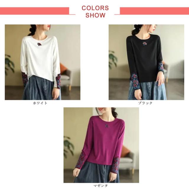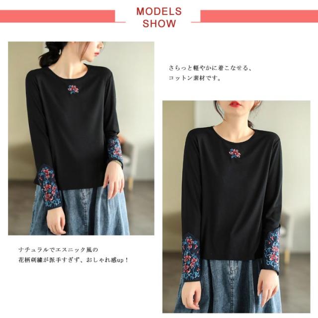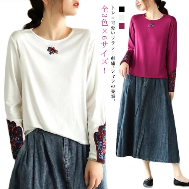 フラワー刺繍tシャツ レディース tシャツ カットソー 送料無料 トップス 花柄 刺繍tシャツ 春 長袖tシャツ コットン ロングT ラウンドネック 秋 エスニック トレロ 可愛い