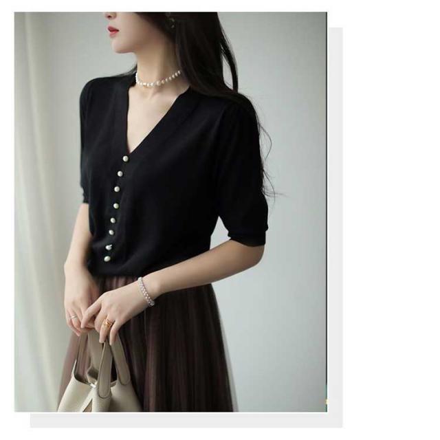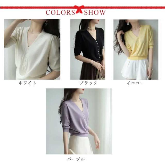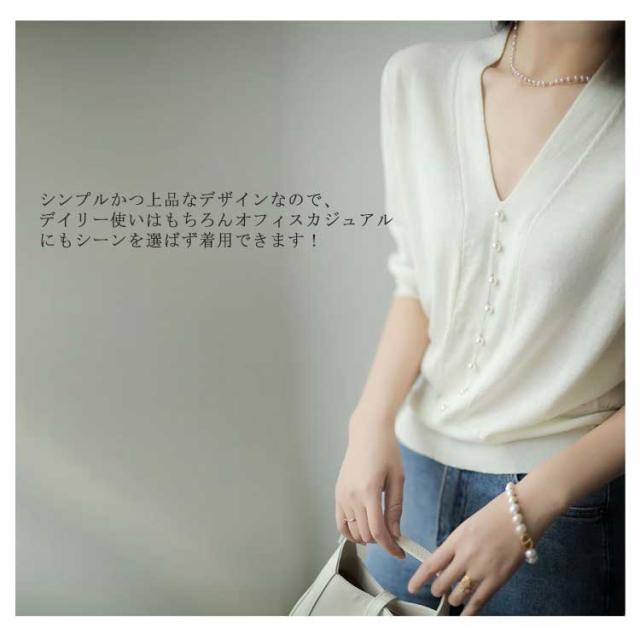 全4色×6サイズ!ニットソー 5分袖 春 ニット トップス 送料無料 レディース サマーニット 半袖ニット vネック パール付き キレイめ オフィス 大人 上品 無地 可愛い 夏 秋