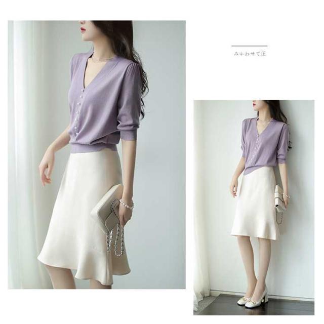 | 全4色×6サイズ!フロントにあしらわれたパールボタンがかわいいニットトップス。 すっきりとしたVネックがデコルテラインを美しく見せてくれるので、シンプルながらも女性らしい印象を作り上げます。 シンプルかつ上品なデザインなので、デイリー使いはもちろんオフィスカジュアルにもシーンを選ばず着用できます! さらっとしたサマーニット生地で涼しく、5分袖なので腕周りのカバーもできます◎ 軽くてソフトな素材感が、上品で大人な抜け感を演出。 パンツからスカートまで、いろいろなスタイルに合わせやすいアイテム。 | |