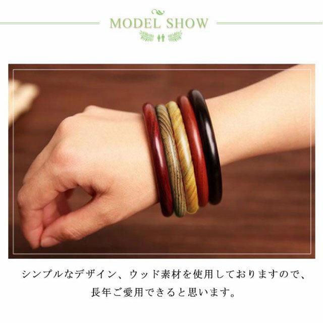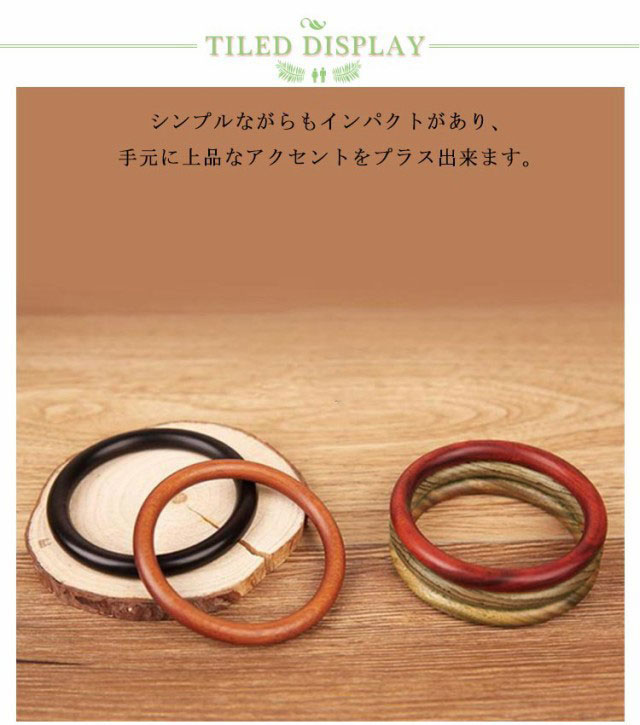 | 天然ウッドを削って作ったナチュラルティストな木のブレスレットです。 シンプルながらもインパクトがあり、手元に上品なアクセントをプラス出来ます。 シンプルなデザイン、ウッド素材を使用しておりますので、長年ご愛用できると思います。 これからの季節に手首まわりのアクセントとして大変活躍してくれると思います。 程よい太さが使いやすいバングル。デイリー使いに1本でも使いやすく、ボリュームを出したいときには重ねづけを。 2、3連をまとめてつけるとインパクトがあっておすすめの付け方です。 | |