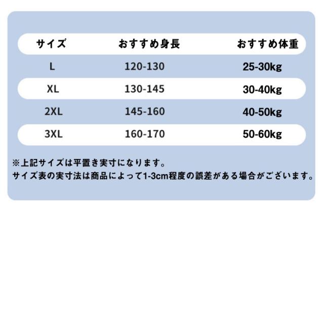 | サイズ | L【120-130cm】 XL【130-145cm】 2XL【145-160cm】 3XL【160-170cm】 |