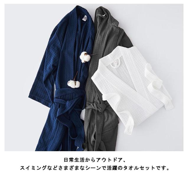 | 袖丈が選べる、肌触りの心地よいワッフル地のバスローブ。 ふんわりとやわらかなタオルの肌触りに優れた吸収性が特徴で、お風呂上がりに大変便利です。 薄手、軽いタオル地を使用していますので夏さわやかに着られる快適なバスローブは、お風呂上り以外にも部屋着やパジャマとして幅広くお使いいただける他、出産祝いや結婚祝い、お誕生日プレゼントなどにもご好評。 日常生活からアウトドア、スイミングなどさまざまなシーンで活躍のタオルセットです。 | |