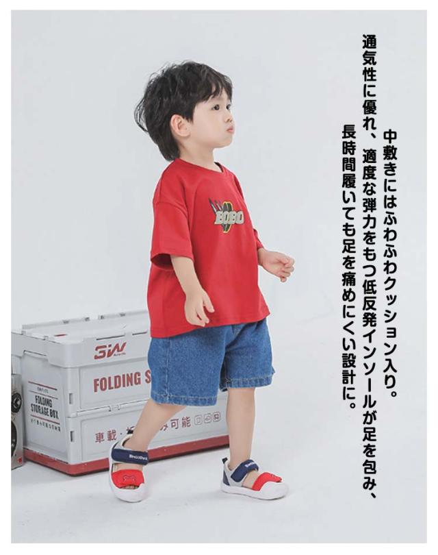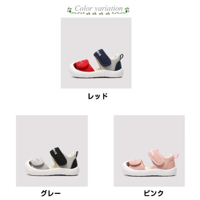| 肌触りのよいやわらかいメッシュ素材を使用したベビーサンダル。 フィット感を調整可能な面ファスナーを、つま先と足の甲部分の2か所に搭載しています。 通気性の良いメッシュ素材をアッパーに使ったベビーサンダルは、夏に履くべき涼しげかつ軽やかな一足だ。 ラバーソールを巻き上げてつま先部分までカバーしており、防滑性に優れているうえつま先のケガを防止できます。 中敷きにはふわふわクッション入り。 通気性に優れ、適度な弾力をもつ低反発インソールが足を包み、長時間履いても足を痛めにくい設計に。 | |