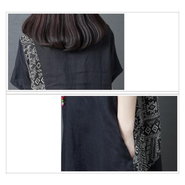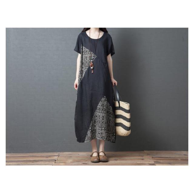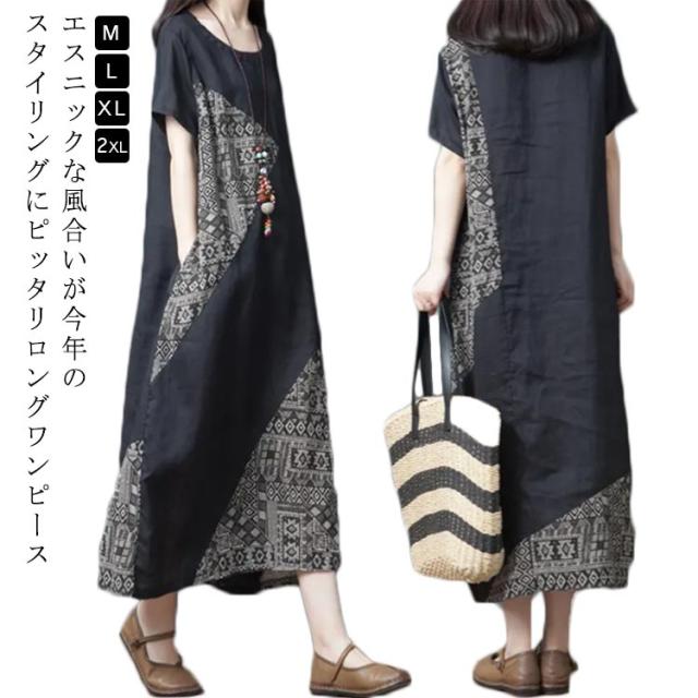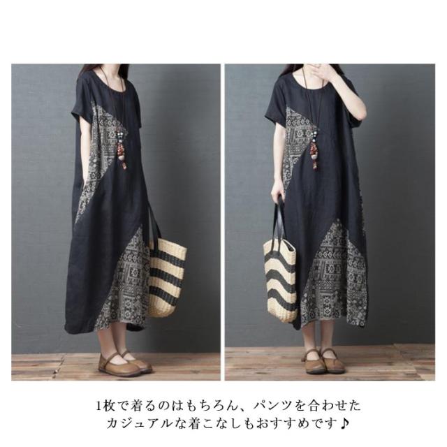 ワンピース マキシワンピース 切り替え 半袖 異素材 エスニック柄 アジアン ゆったり カジュアル おしゃれ ロングワンピース クルーネック ロング丈 レディース 体型カバー きれいめ 大人 女性 可愛い 大きいサイズ 着痩せ 秋 春 夏 ナチュラル ギフト プレゼント 送料無料