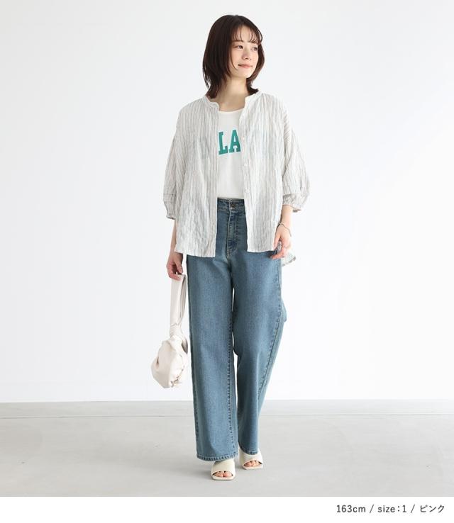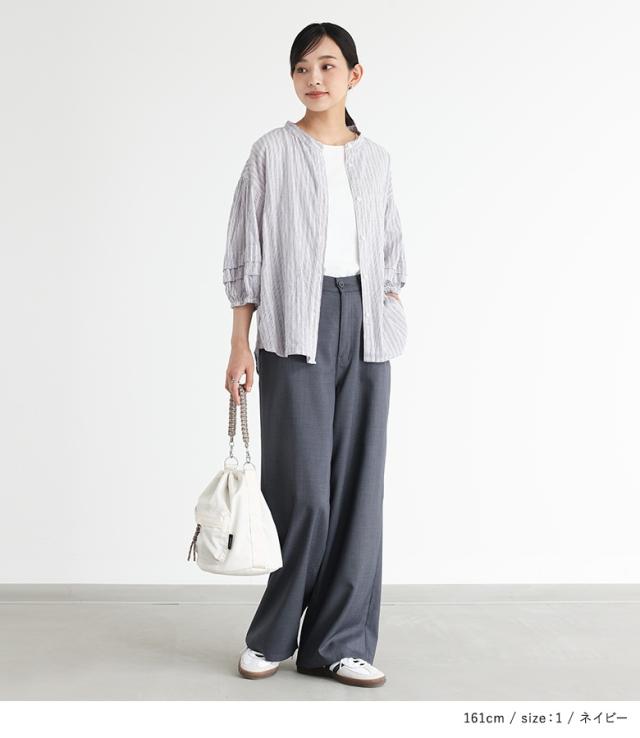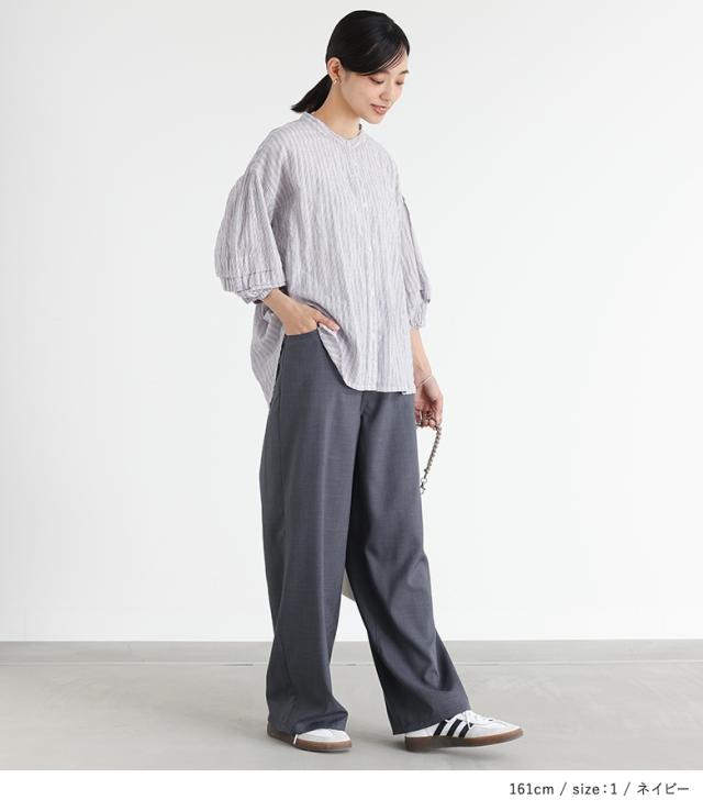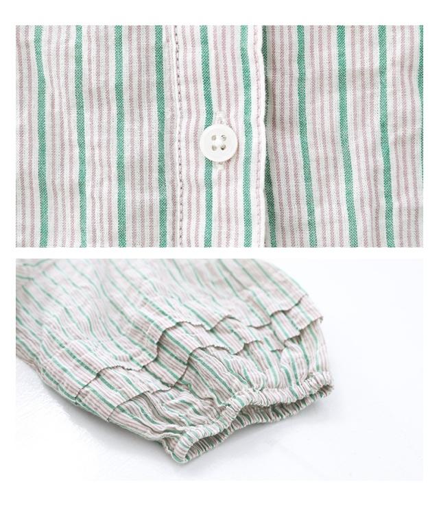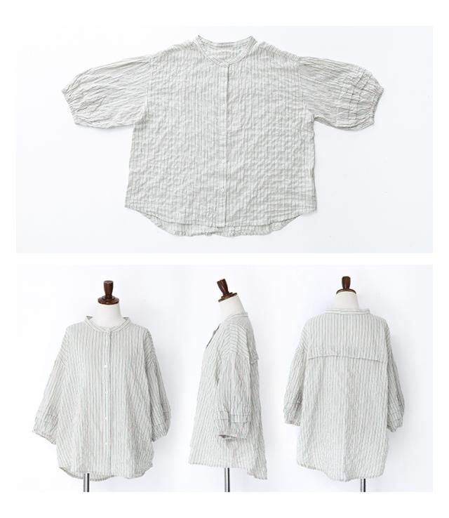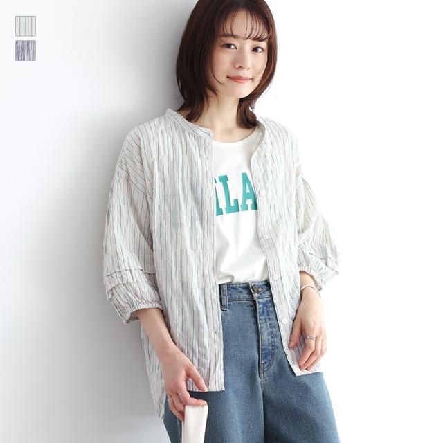 ■デザイン 配色のストライプ柄が爽やかな印象のブラウス。袖&後ろヨークの大きいタックがアクセントになった一枚。ボリューム袖が女性らしく、袖口にはゴムを入れて袖丈の調節ができる仕様に。バンドカラーで首回りもすっきり見えするデザインです。 ■素材 肌馴染みの良い、コットン混のストライプ生地を使用。爽やかで清涼感のある生地です。 ※やや透け感がございますのでインナーのご着用をおすすめいたします。 ■コーディネート 前を閉じてブラウスとしてはもちろん、ボタンを開けて羽織りとしてもご着用いただけます。Tシャツなどの上にさっと羽織った、ナチュラルな着こなしがおすすめです。 |