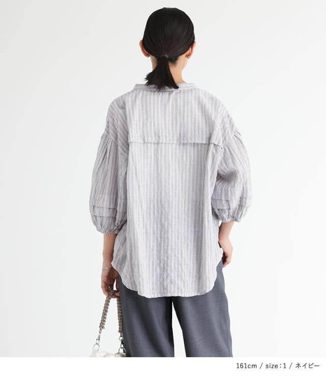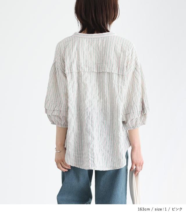『ストライプ柄ボリュームスリーブブラウス』※メール便可※【10】[ブラウス トップス レディース 羽織 シャツ 七分袖 ストライプ柄 綿混 タック ボリューム袖 ボリュームスリーブ 配色 バンドカラー 袖口ゴム 清涼感]