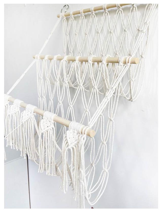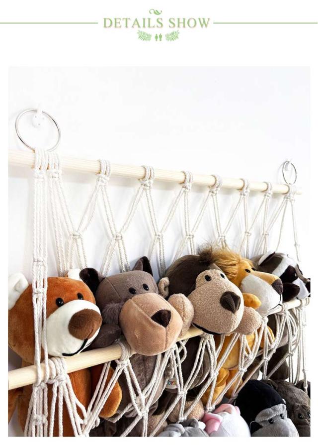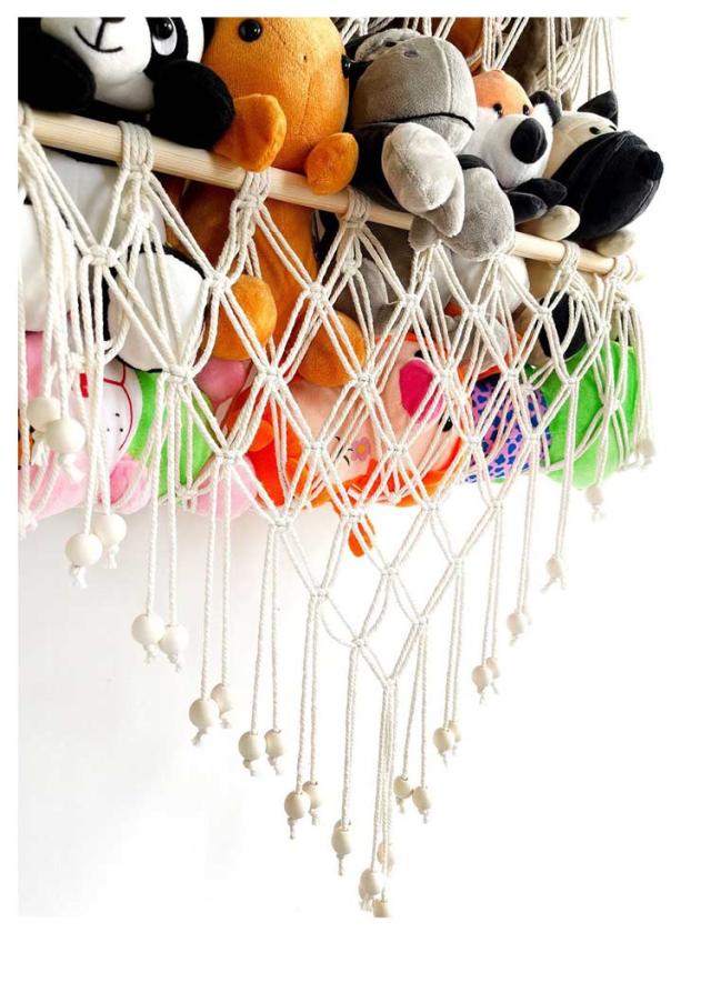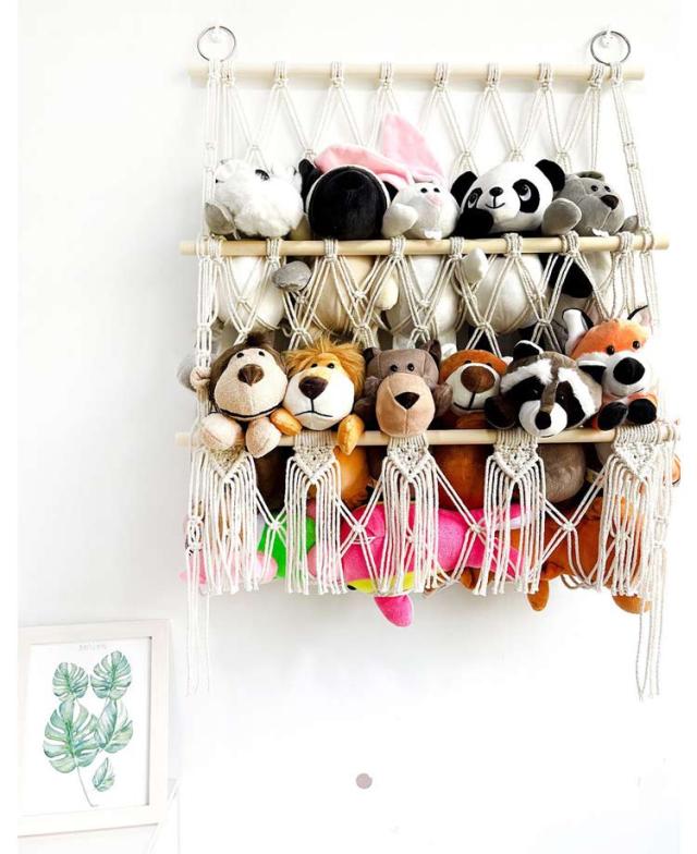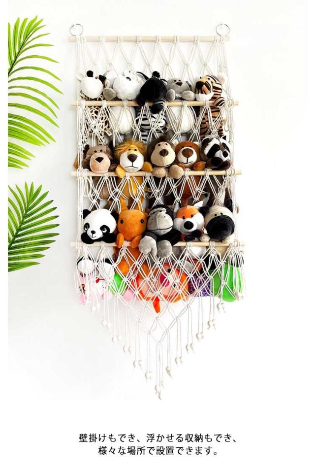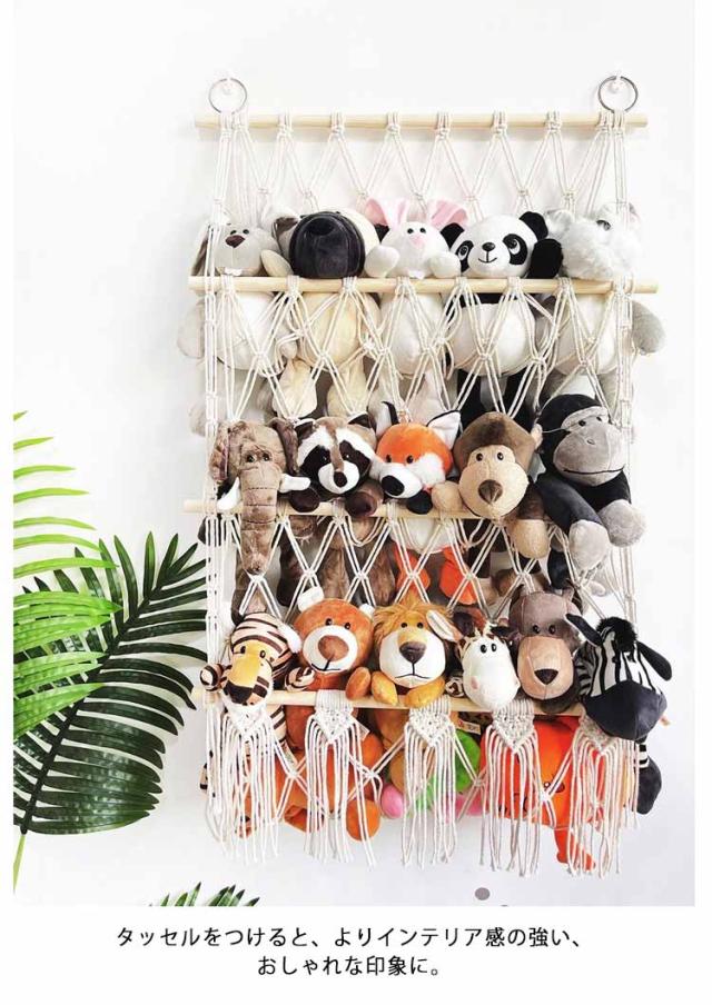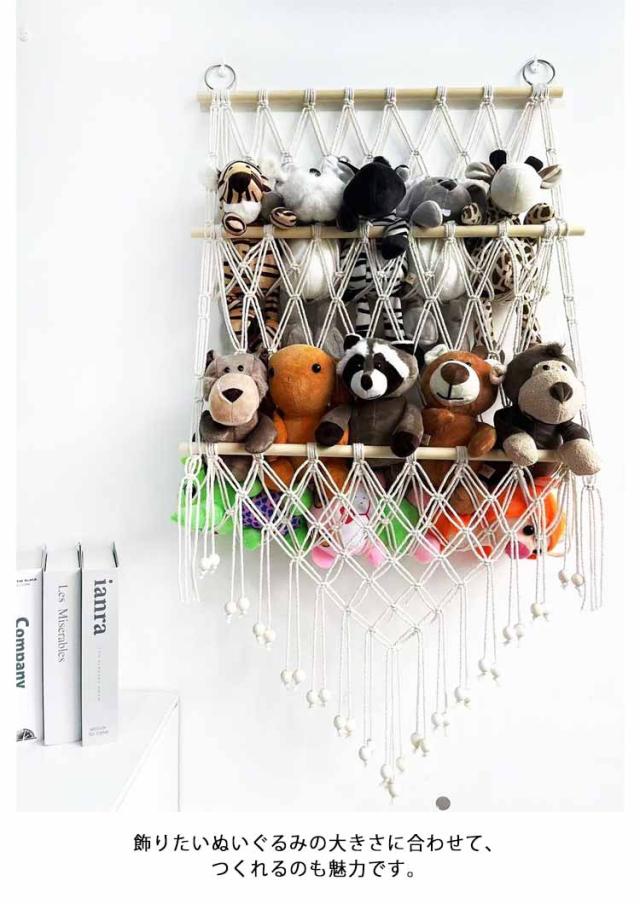 | 収納に困っているぬいぐるみをきれいに収納することができるマクラメハンモック。 壁掛けもでき、浮かせる収納もでき、様々な場所で設置できます。 ぬいぐるみ収納をしながら飾ることができるため、一石二鳥です。 タッセルをつけると、よりインテリア感の強い、おしゃれな印象に。 飾りたいぬいぐるみの大きさに合わせて、つくれるのも魅力です。 | |