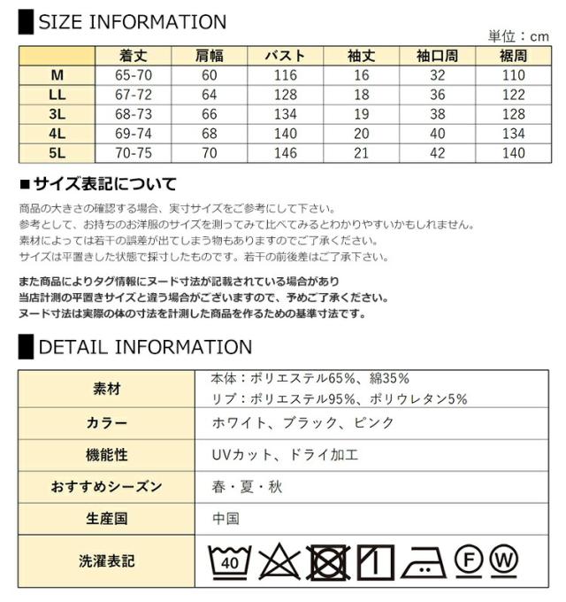 5L:着丈70-75 肩幅70 バスト146 袖丈21 袖口周42 裾周140