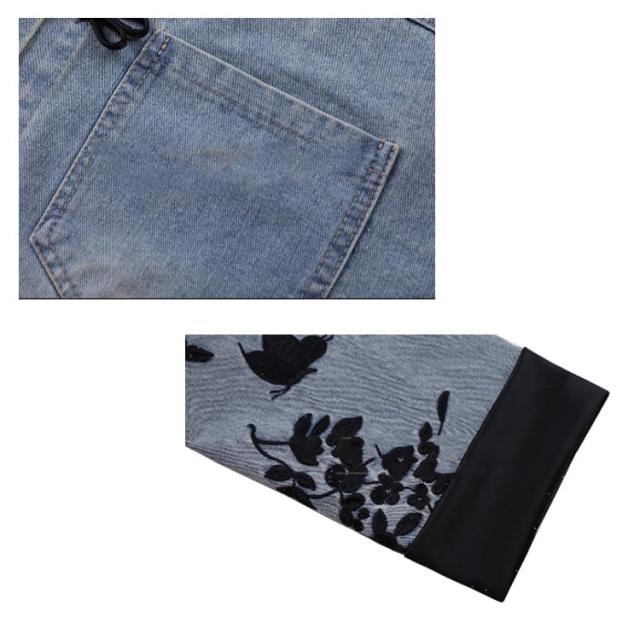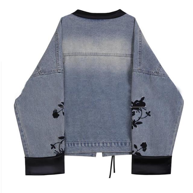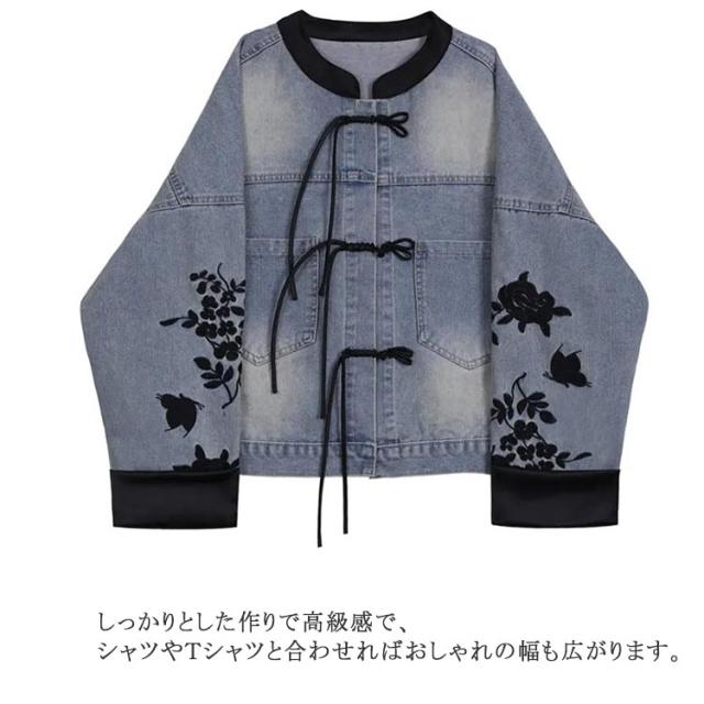 送料無料 デニムジャケット ノーカラー ジャンパー レディース Gジャン デニム コート チャイナ風 ジージャン チャイナボタン 刺繍 長袖 羽織り ライトアウター 花柄 ゆったり カジュアル アウター オーバーサイズ 大人 トップス 春 夏 秋
