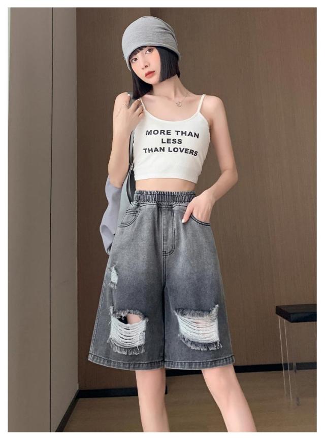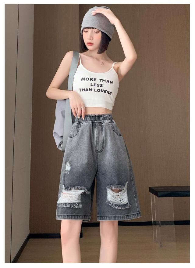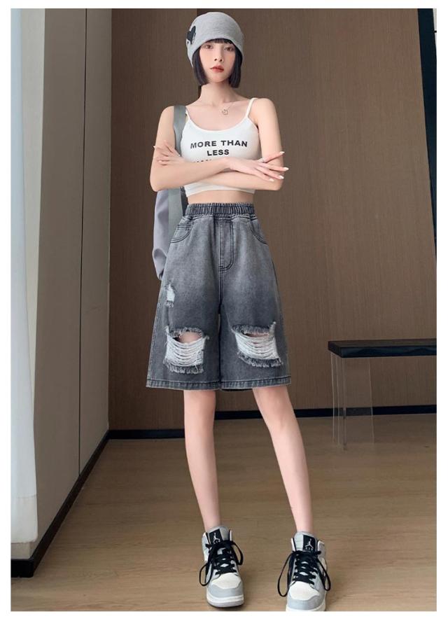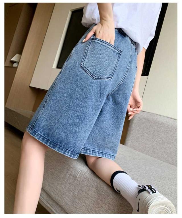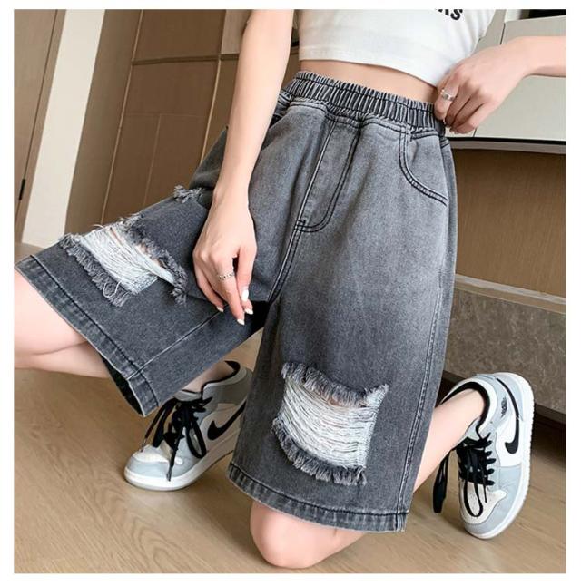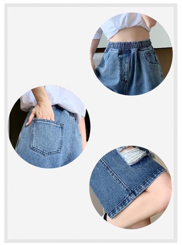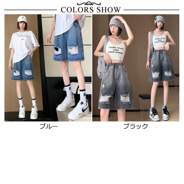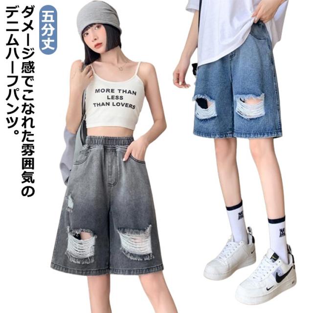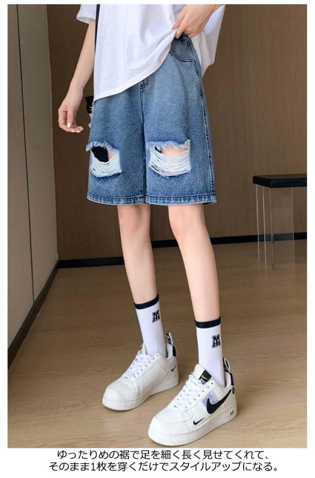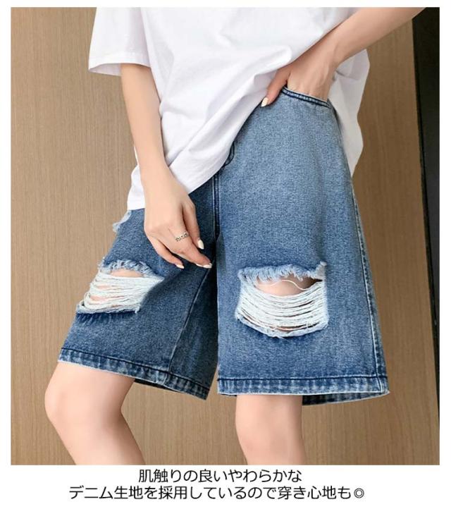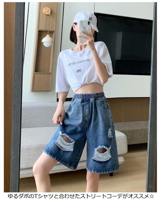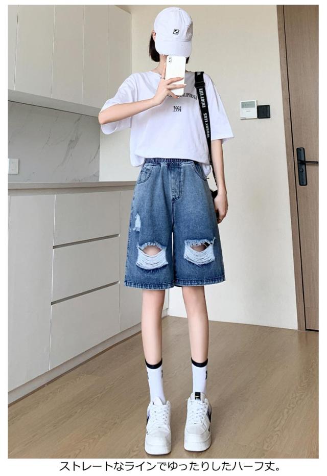 送料無料 ひざ上丈 ハイウエスト デニム ハーフパンツ ショートパンツ レディース デニムパンツ ダメージ加工 短パン ストーレート ウエストゴム 太もも カバーアップ 大きいサイズ 体型カバー 膝上丈 ひざ丈 五分丈 Aライン 水着 春 夏 夏用