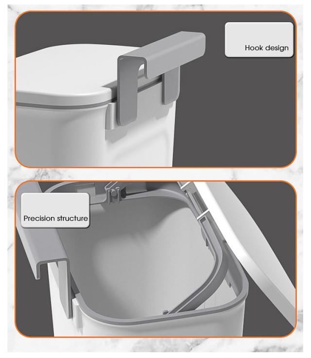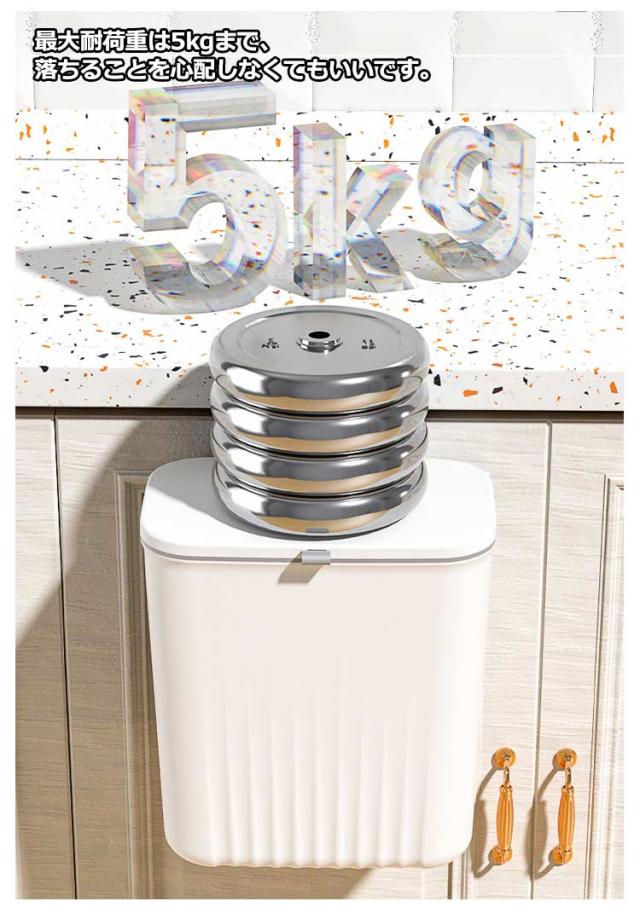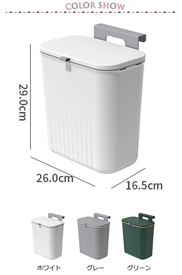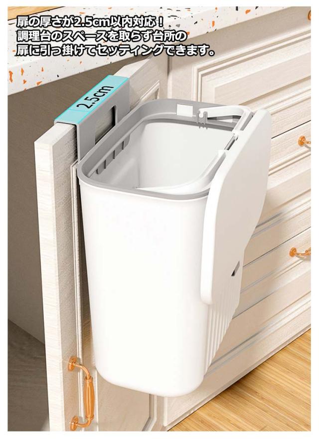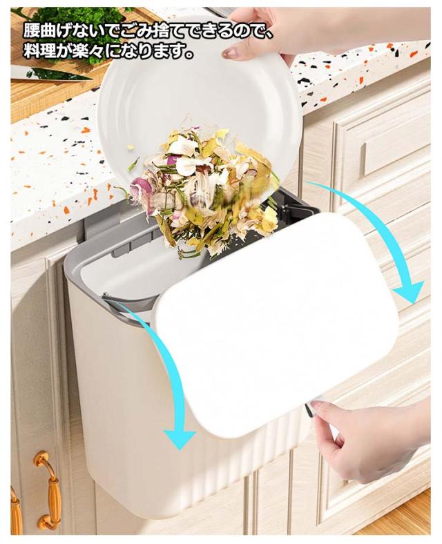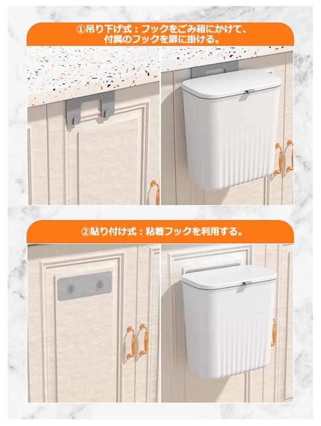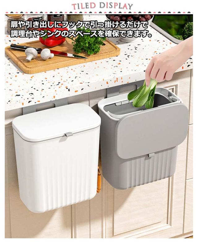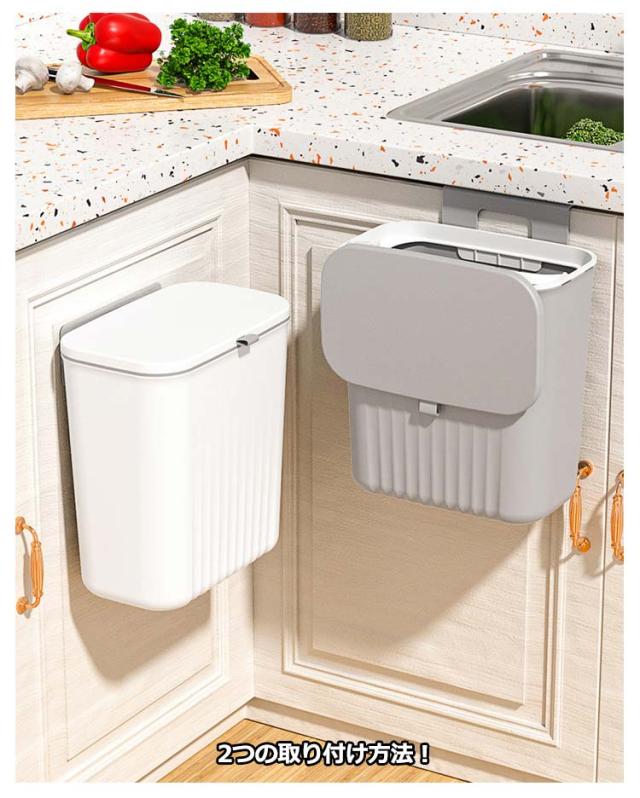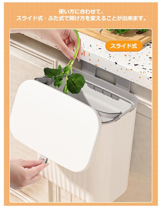 | 【大容量ゴミ箱】【扉に掛ける】【蓋付きニオイ対策】 扉や引き出しにフックで引っ掛けるだけで調理台やシンクのスペースを確保できます。 腰曲げないでごみ捨てできるので、料理が楽々になります。 使い方に合わせて、スライド式・ふた式で開け方を変えることが出来ます。 投入口が大きいので、調理時に出たゴミを捨てるときなどにも役立ちます。 9Lの大容量でキッチンや洗面所など生ゴミや小物を収納できます。 蓋つきなので、しっかりと密封され、ゴミを露出させず、ゴミ箱内の臭いなどを効果的に隔離します。 最大耐荷重は5kgまで、落ちることを心配しなくてもいいです。 扉の厚さが2.5cm以内対応!調理台のスペースを取らず台所の扉に引っ掛けてセッティングできます。 2つの取り付け方法!1.吊り下げ式:フックをごみ箱にかけて、付属のフックを扉に掛ける。2.貼り付け式:粘着フックを利用する。 | |