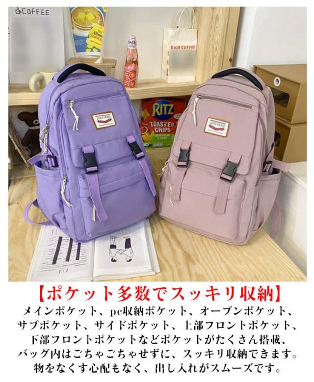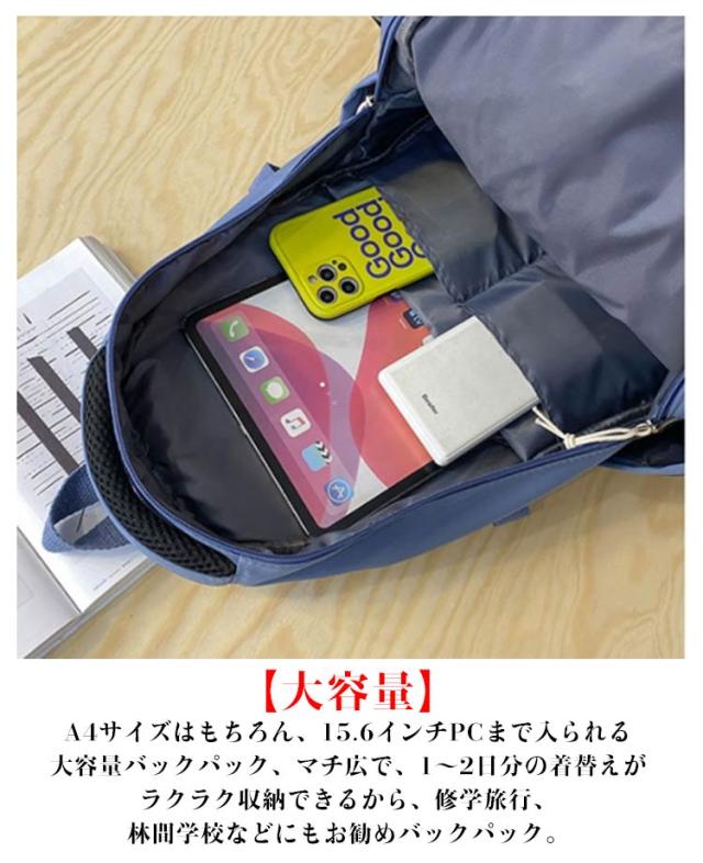 | 軽量・A4・15.6インチPC対応の大容量リュックサック。 【大容量】A4サイズはもちろん、15.6インチPCまで入られる大容量バックパック、マチ広で、1〜2日分の着替えがラクラク収納できるから、修学旅行、林間学校などにもお勧めバックパック。 【ポケット多数でスッキリ収納】メインポケット、pc収納ポケット、オープンポケット、サブポケット、サイドポケット、上部フロントポケット、下部フロントポケットなどポケットがたくさん搭載、バッグ内はごちゃごちゃせずに、スッキリ収納できます。物をなくす心配もなく、出し入れがスムーズです。 【耐久性】耐摩擦性が強いナイロン素材を採用し、丁寧な縫製で多くの物を運んでも心配ありません。 【超軽量】約0.49KGの超軽量設計、普段の通学や長距離の移動も負担にならず、ラクラク。 【快適な背負い心地】肩幅もクッション入れで柔らかく、負担を軽減し、疲れにくい。 【2way】背負ったり、手提げしたりできる2WAY仕様。手提げ部分もクッション入りで、痛くなりにくい。 【様々なシーンで活躍】デイリー使いはもちろん、通勤・通学、アウトドアや旅行などのおでかけにも大活躍のリュックサックです。 | |