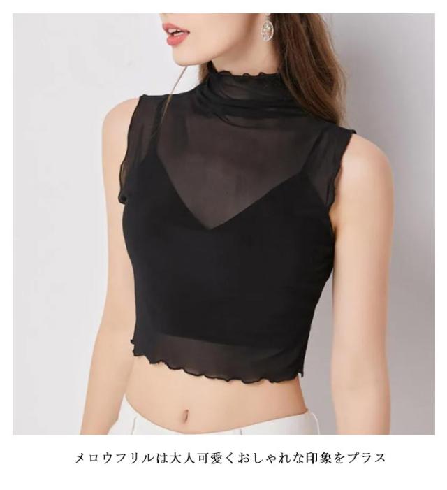 シアートップス ハイネック 透け感 トップス ブラウス シャツ ノースリーブ フリル タンクトップ 2枚セット ショート 伸縮性 ストレッチ 紫外線防止 紫外線対策 uvカット 薄手 シースルー インナー サマー 春夏 重ね着 レイヤード 黒 白 薄い 重ね着 送料無料
